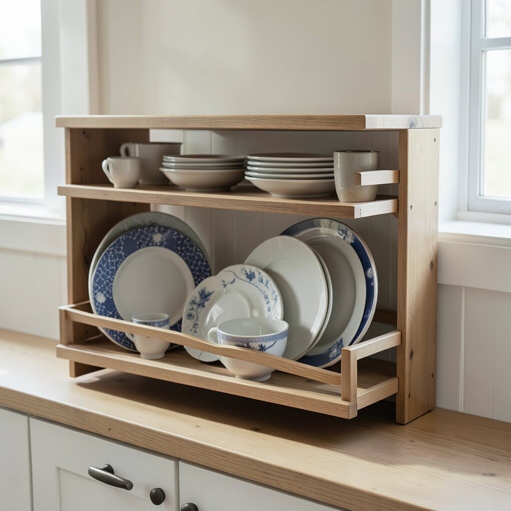 A built-in plate rack feels polished and neat. It looks like it belongs right there, almost as if the kitchen was made around it.
