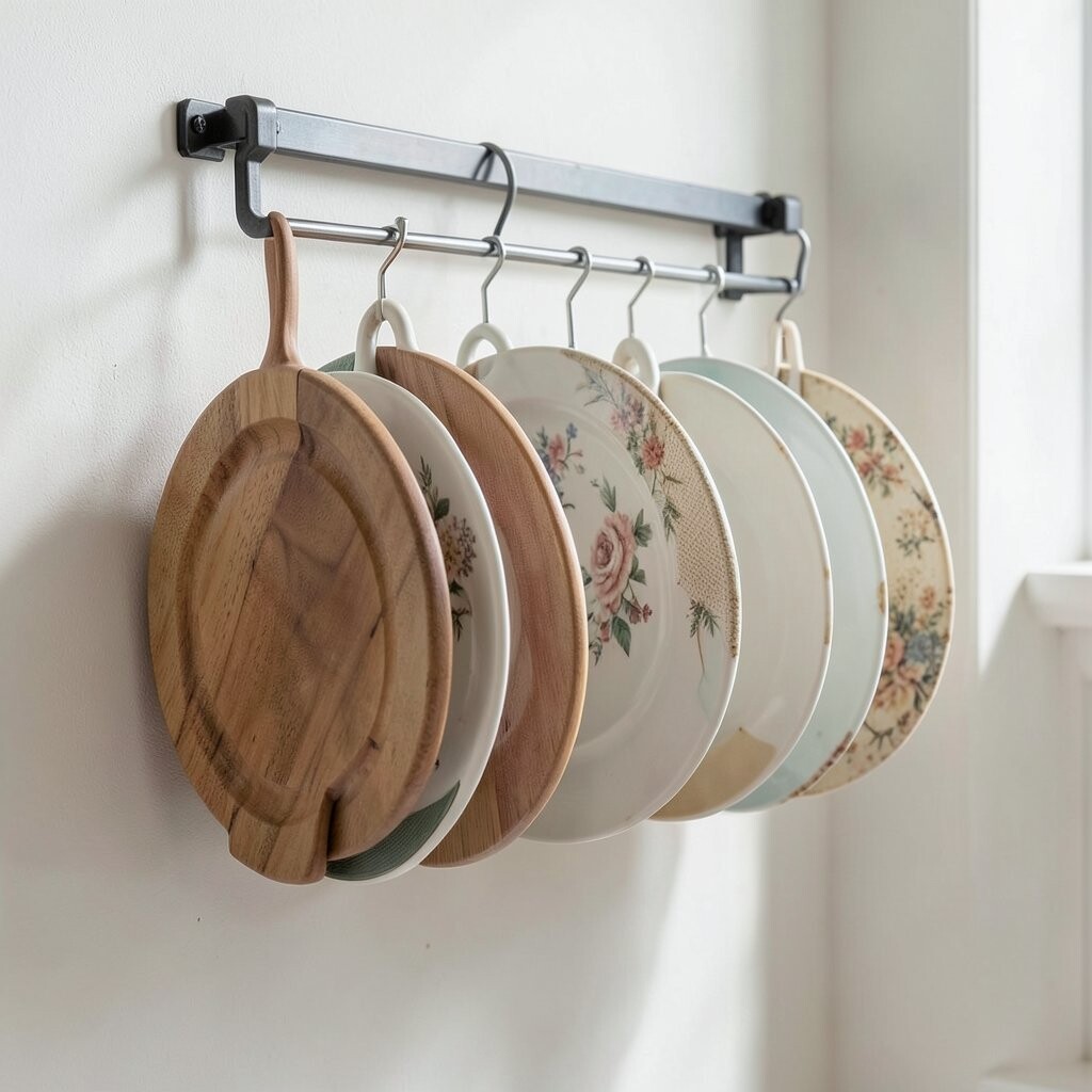 The hooks give it a unique look that feels a bit more relaxed than a shelf. You can use matching plates for a calm feel or mix colors for more fun.