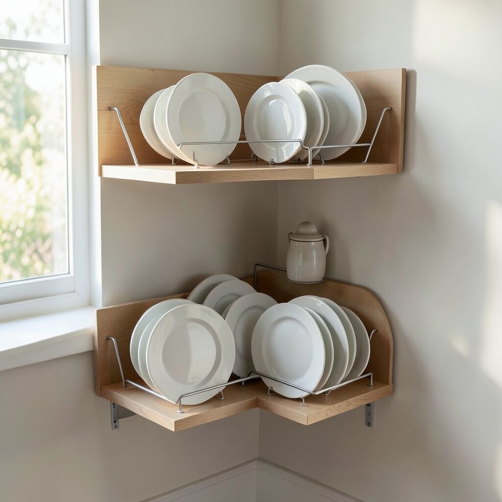 A corner plate rack uses space that often gets ignored. It fits neatly into a corner and turns it into a pretty little display spot.