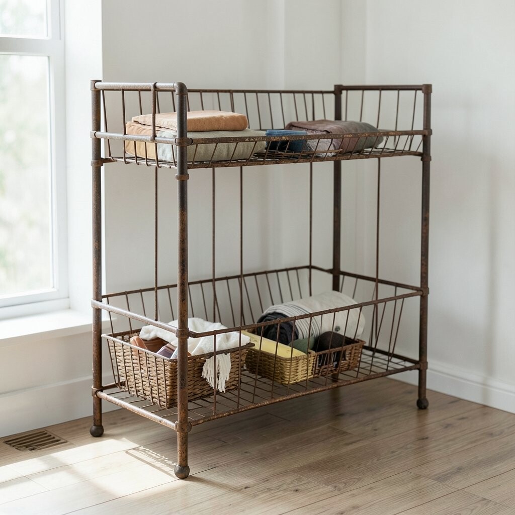 Wire racks bring a sweet, old-fashioned feel that many homes love. The thin metal lines make the whole piece look delicate and light.
