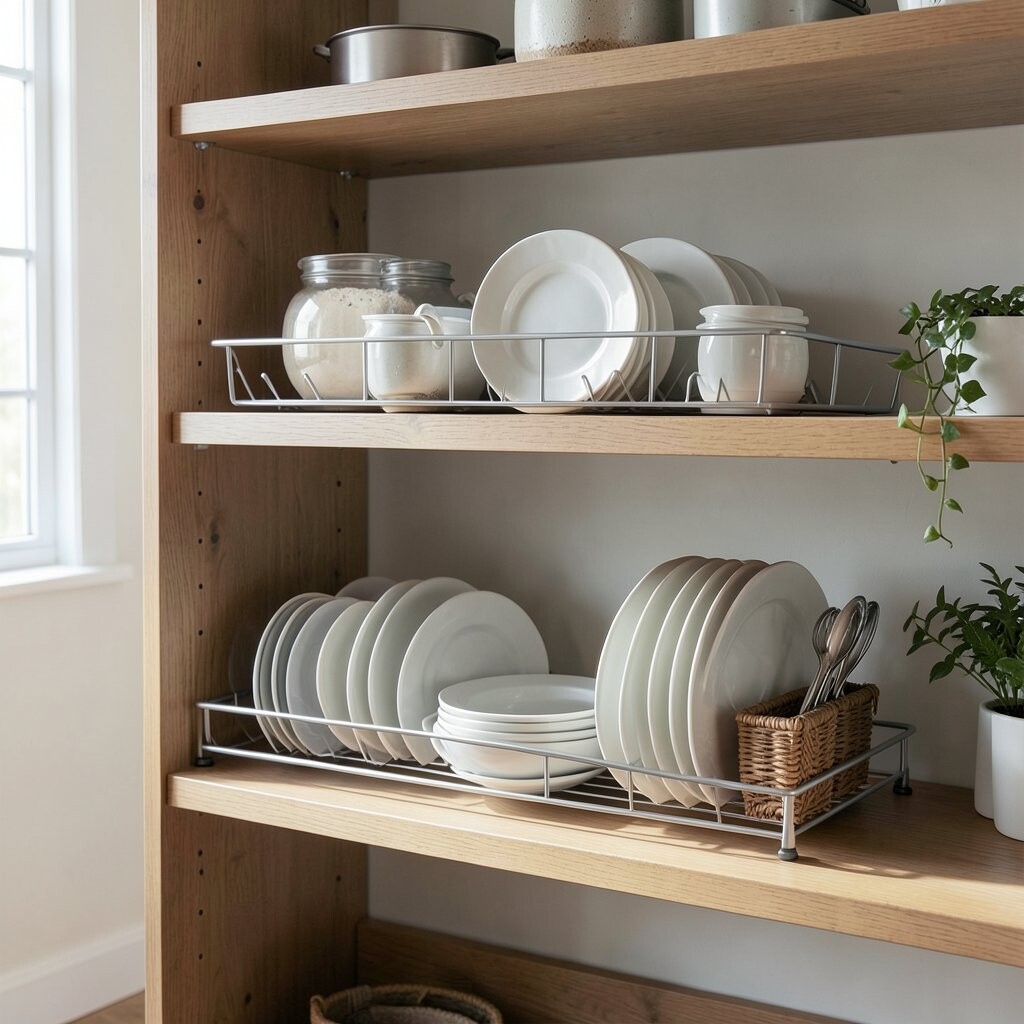 A rack made for open shelving helps your dishes look neat and pretty. It keeps plates in place so open shelves do not feel messy.