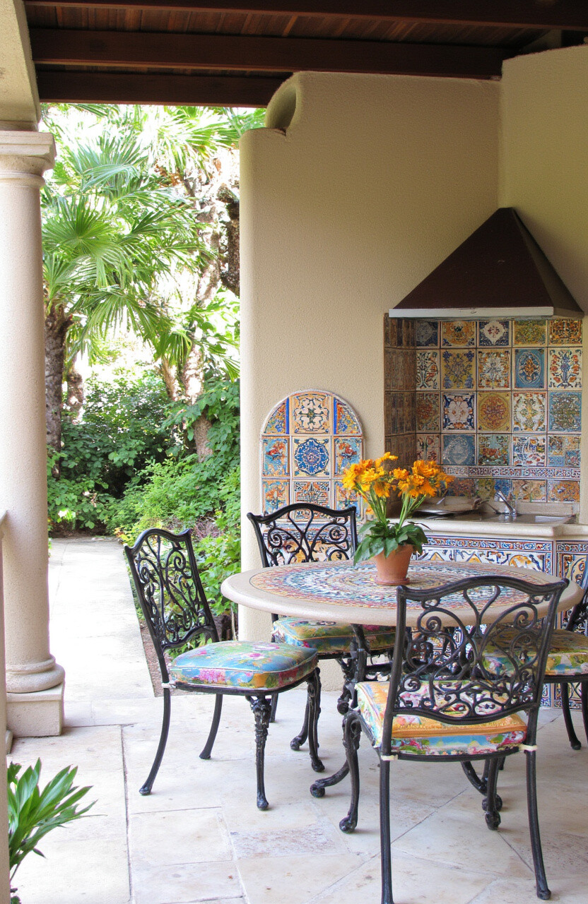 The unique tile designs add an artistic element and a splash of color. It’s a feast for the eyes and the soul. Consider adding some wrought iron furniture or a mosaic table to complete the look.