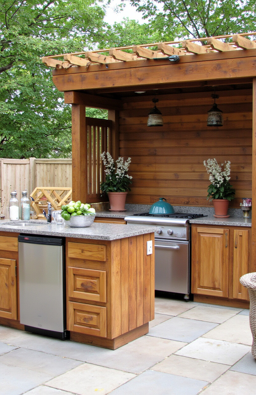 Imagine a kitchen that feels like a cozy cabin retreat, right by your pool. Using reclaimed wood for the cabinets and counters can create a warm, inviting atmosphere. Add a wooden pergola overhead to provide shade and complete the rustic vibe.