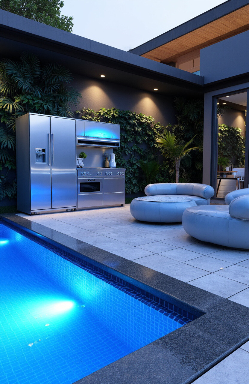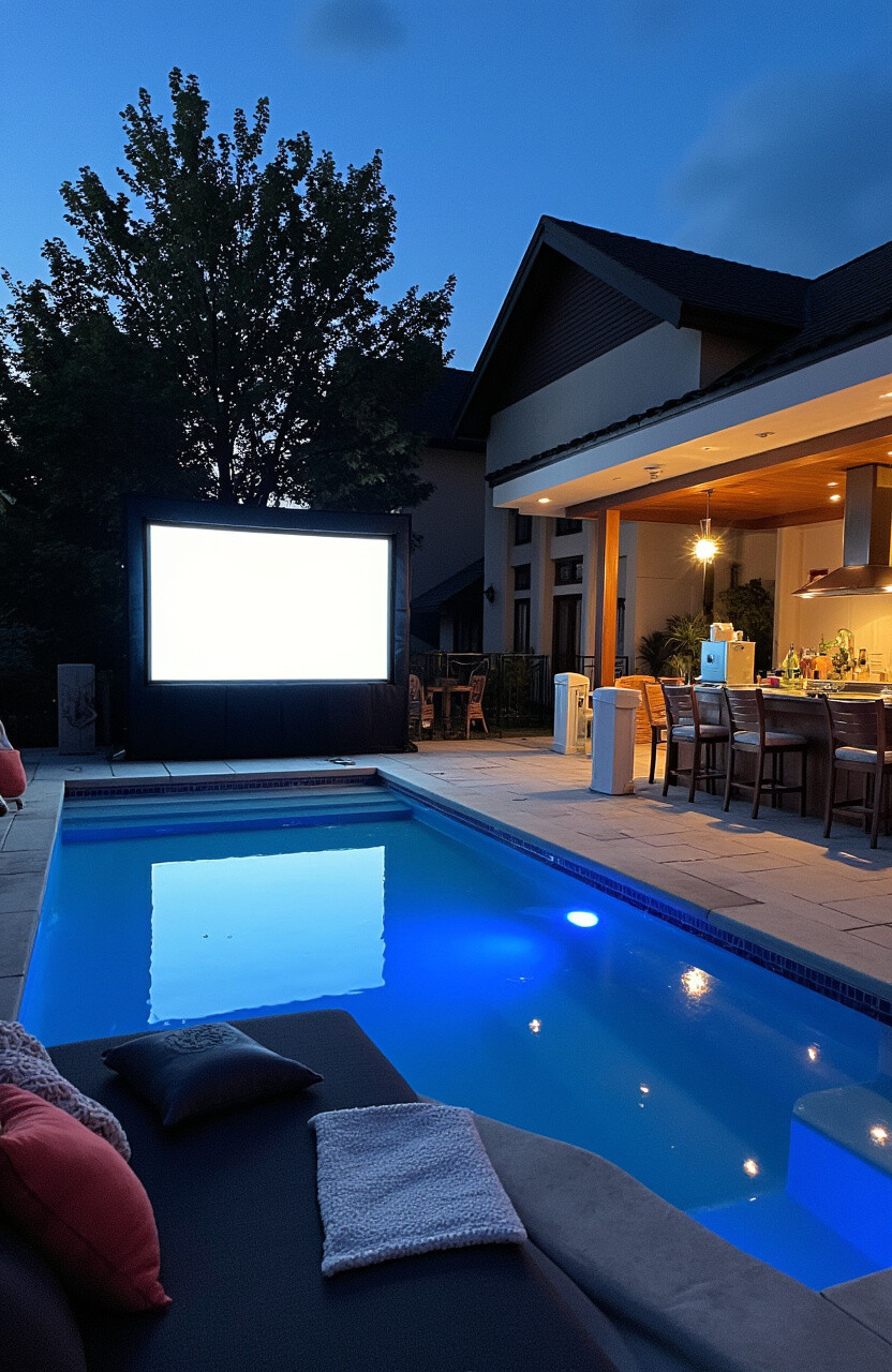 Imagine a pool terrace with a kitchen setup and an outdoor cinema. Use comfortable seating, a projector, and a big screen for movie nights. A popcorn machine can make the experience even better.