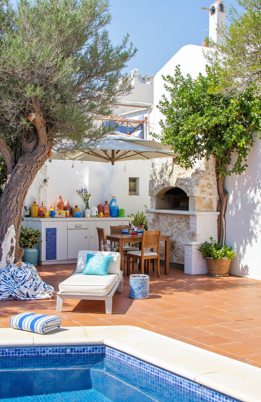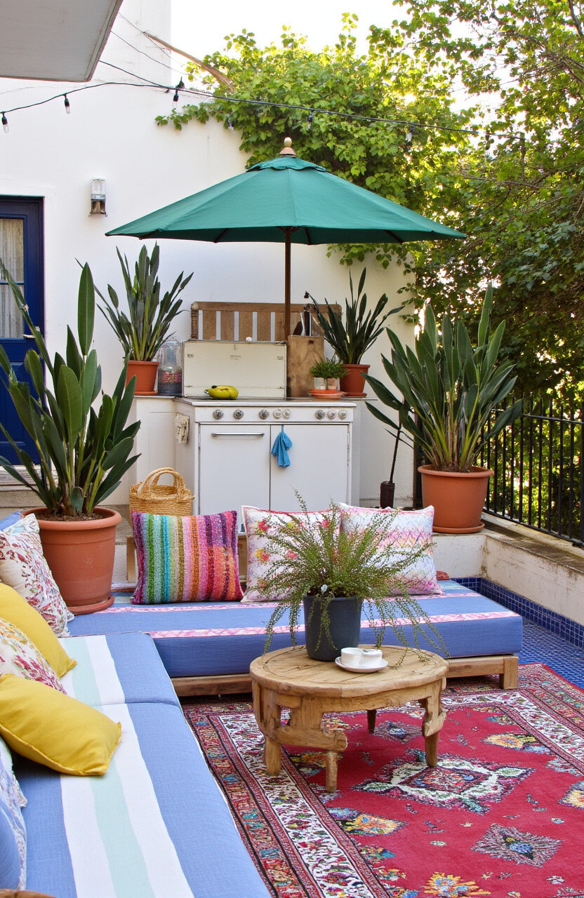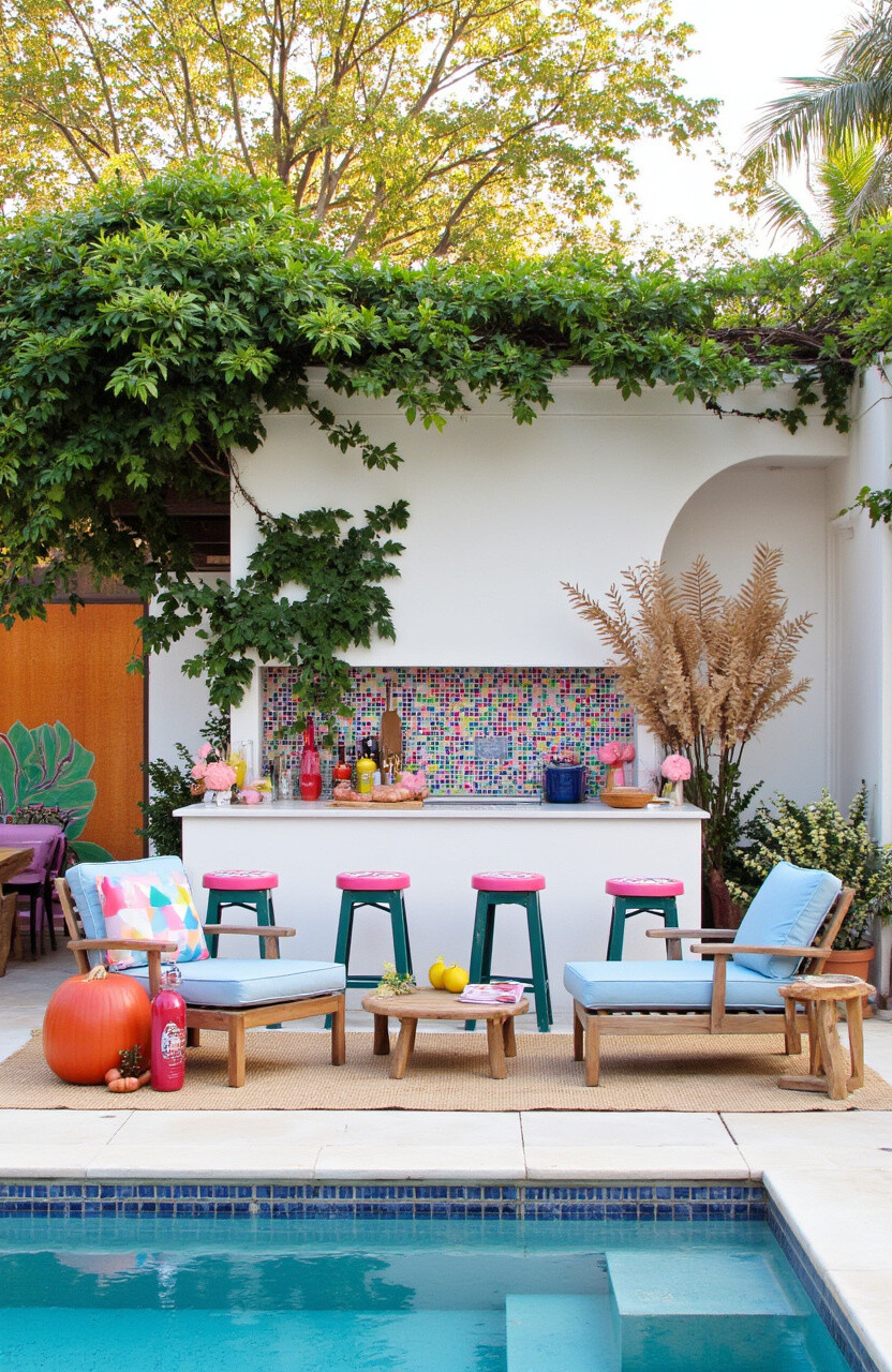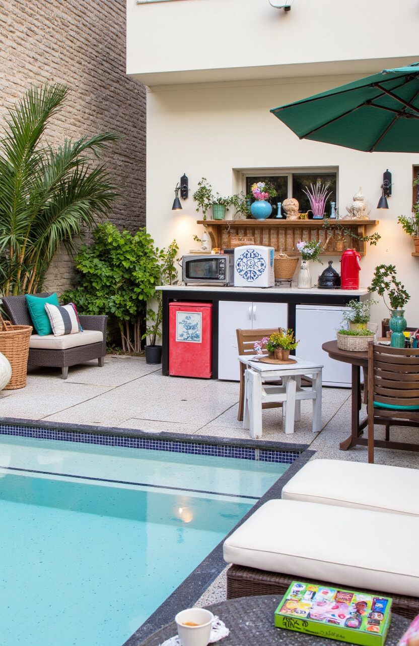 For a bohemian-inspired pool terrace, think eclectic patterns, vibrant colors, and lots of textiles. A mix of vintage and modern kitchen appliances can add to the charm. String lights can create a magical ambiance.