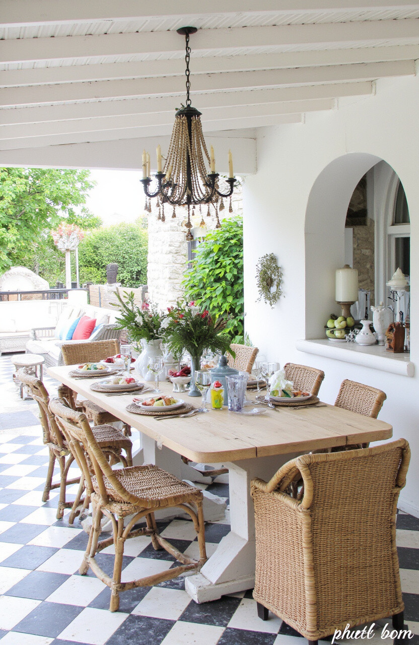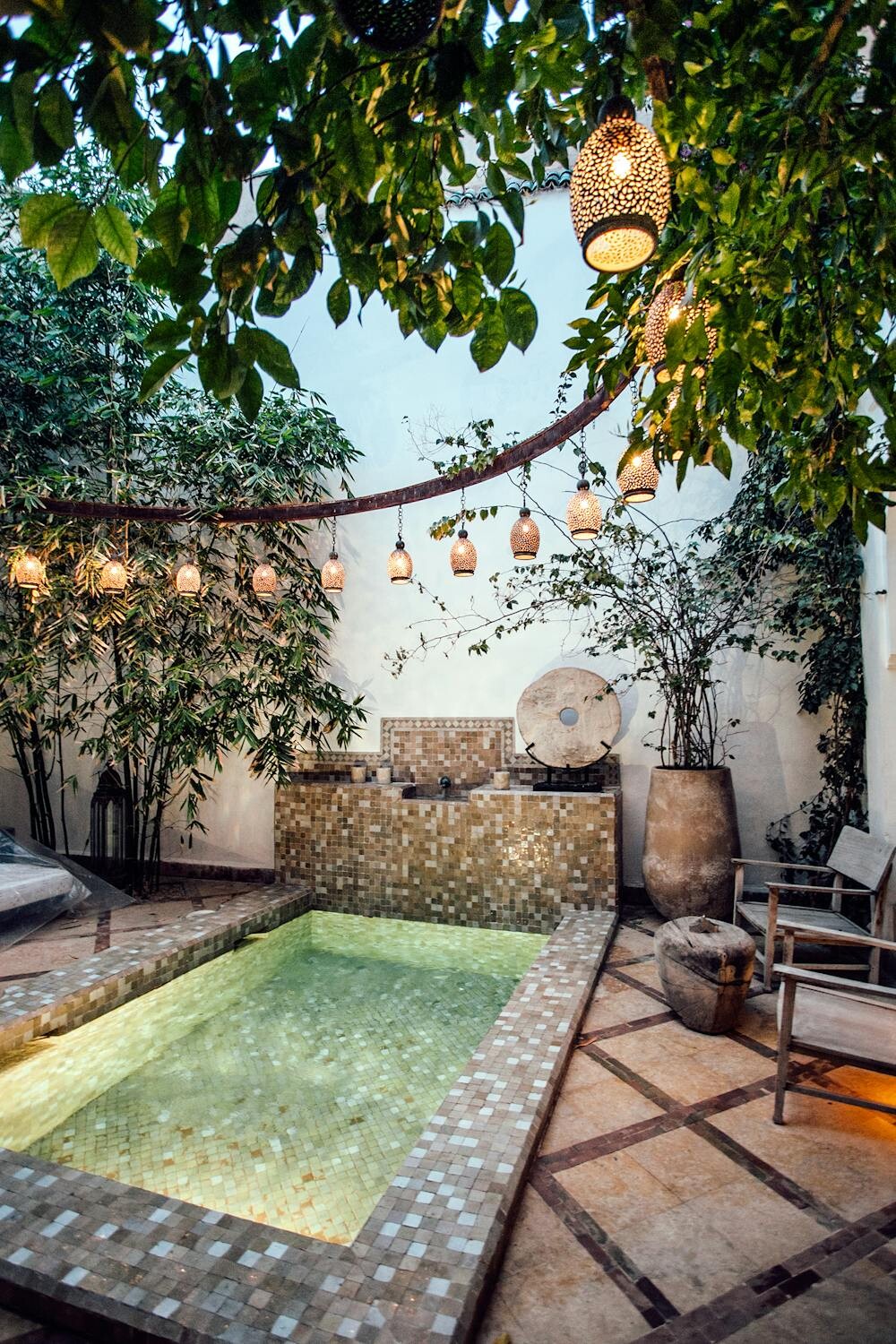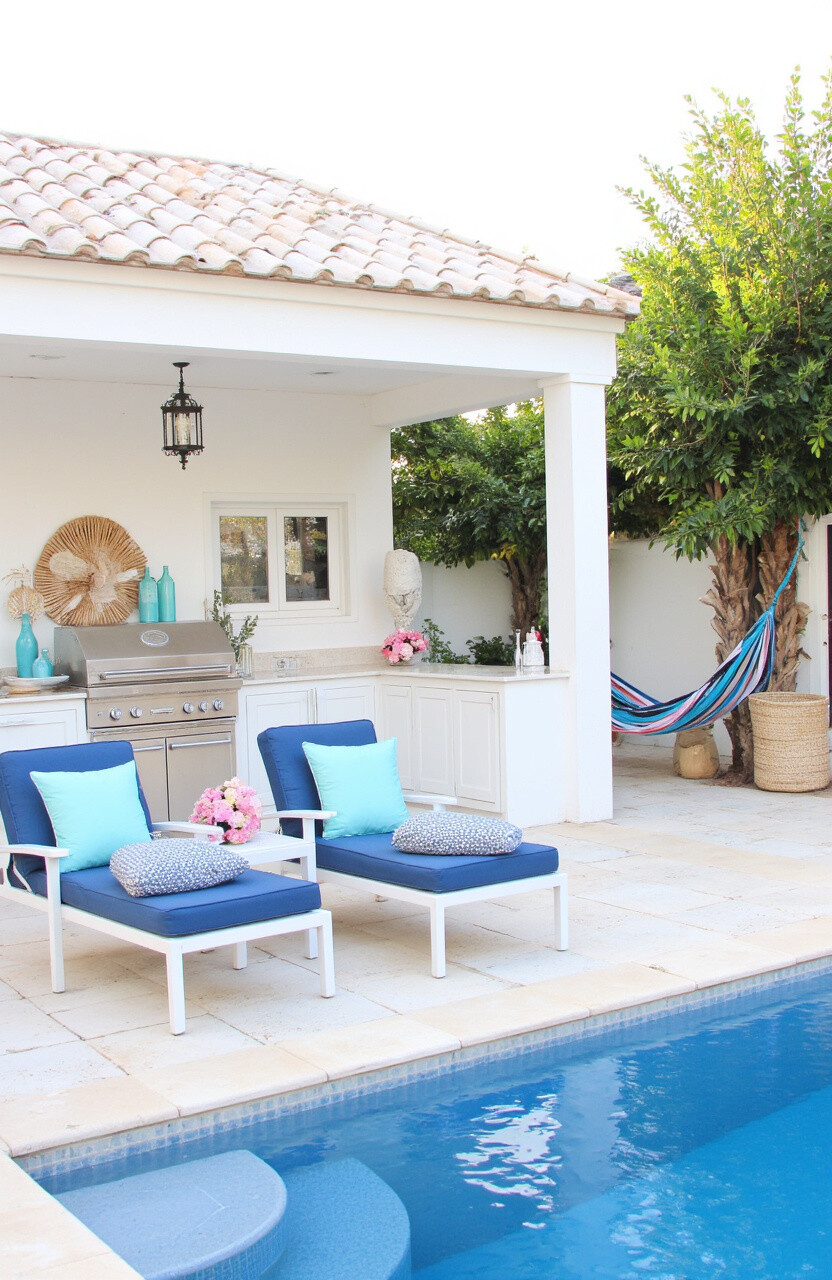 For a bohemian-inspired pool terrace, think eclectic patterns, vibrant colors, and lots of textiles. A mix of vintage and modern kitchen appliances can add to the charm. String lights can create a magical ambiance.