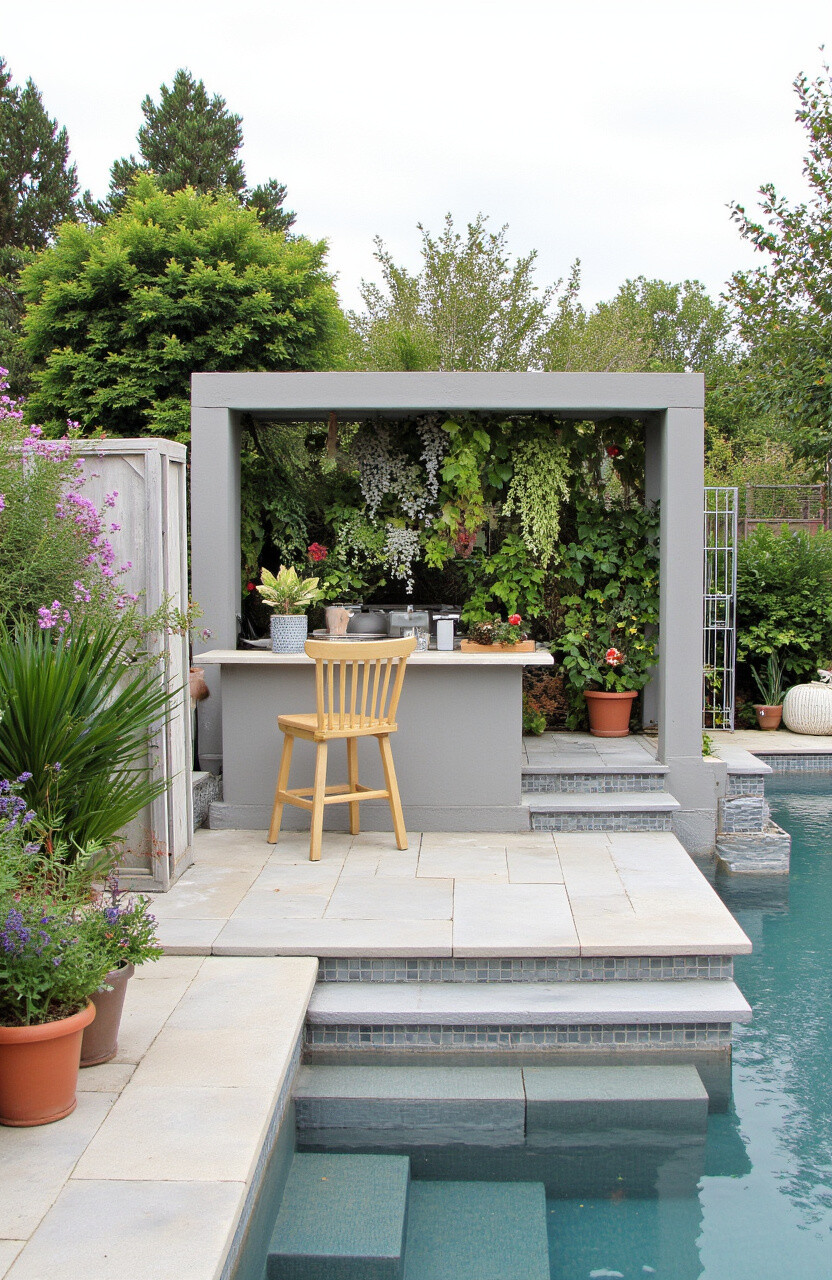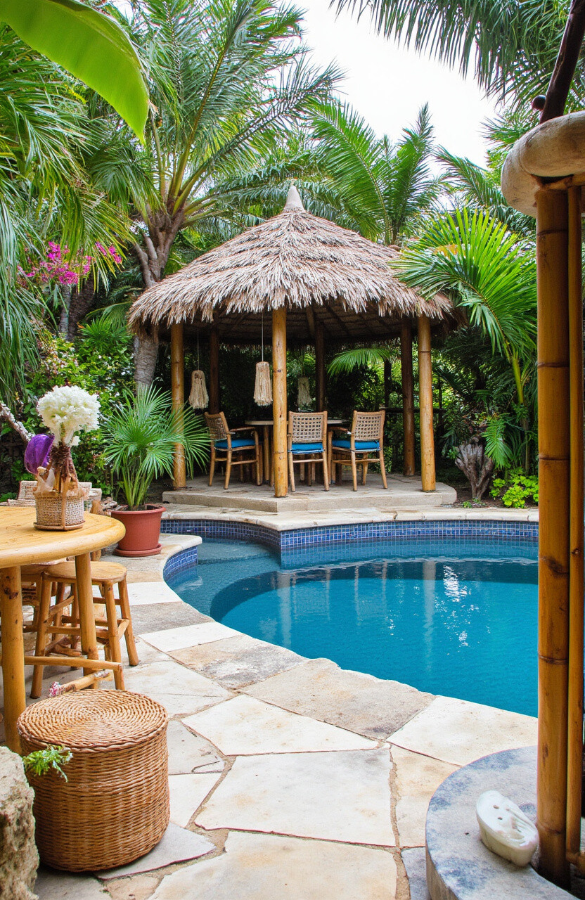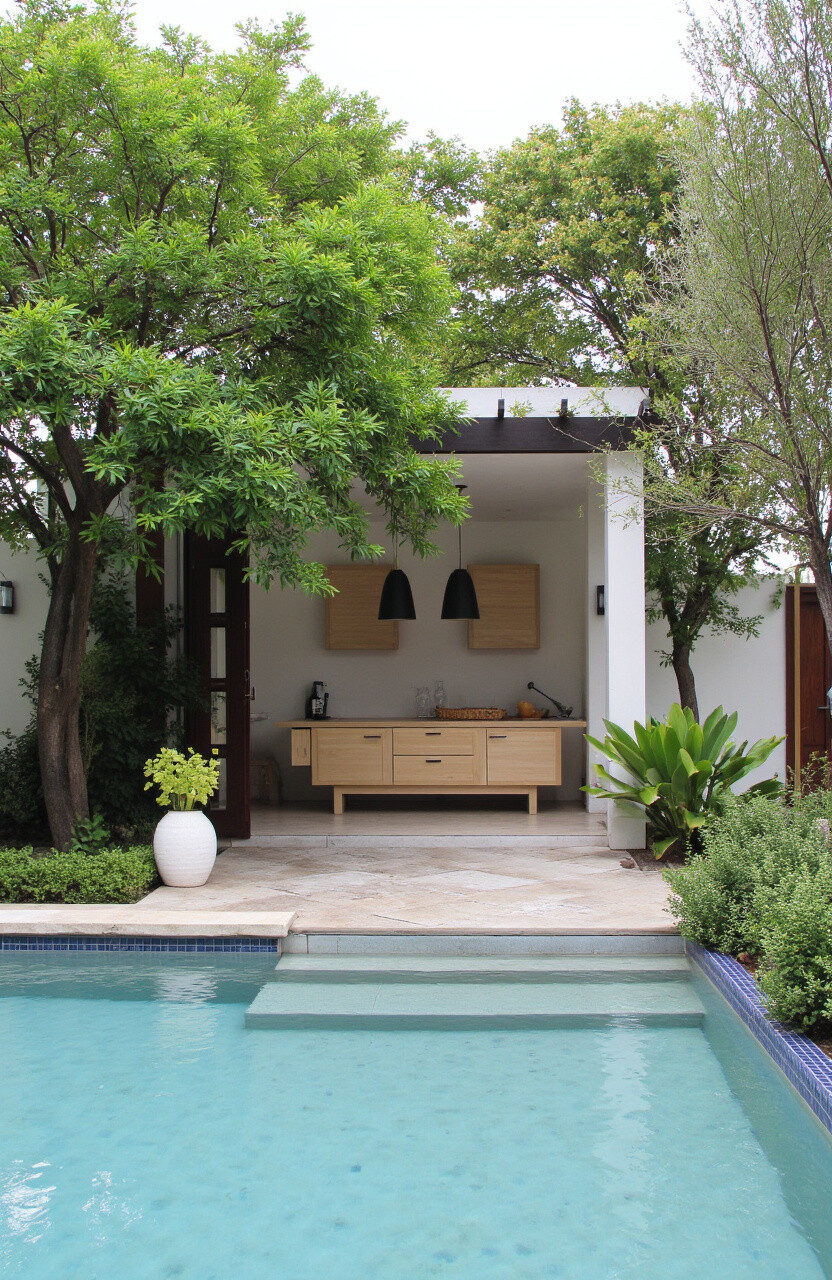 Imagine your pool terrace surrounded by lush greenery, with a kitchen setup that makes you feel like you’re in a tropical paradise. Use bamboo and rattan furniture to enhance this vibe. Add a tiki bar for serving refreshing drinks.