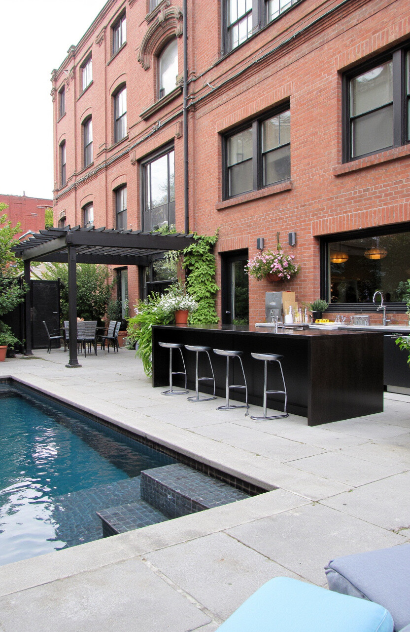 Think sleek lines, monochrome colors, and functional design. A modern minimalist pool terrace is all about simplicity and elegance. Stainless steel appliances and simple furniture can make this setup shine.