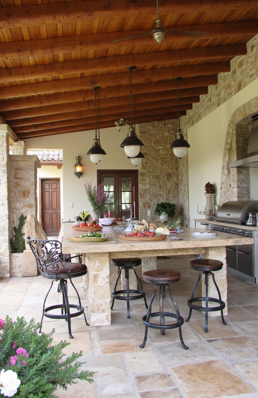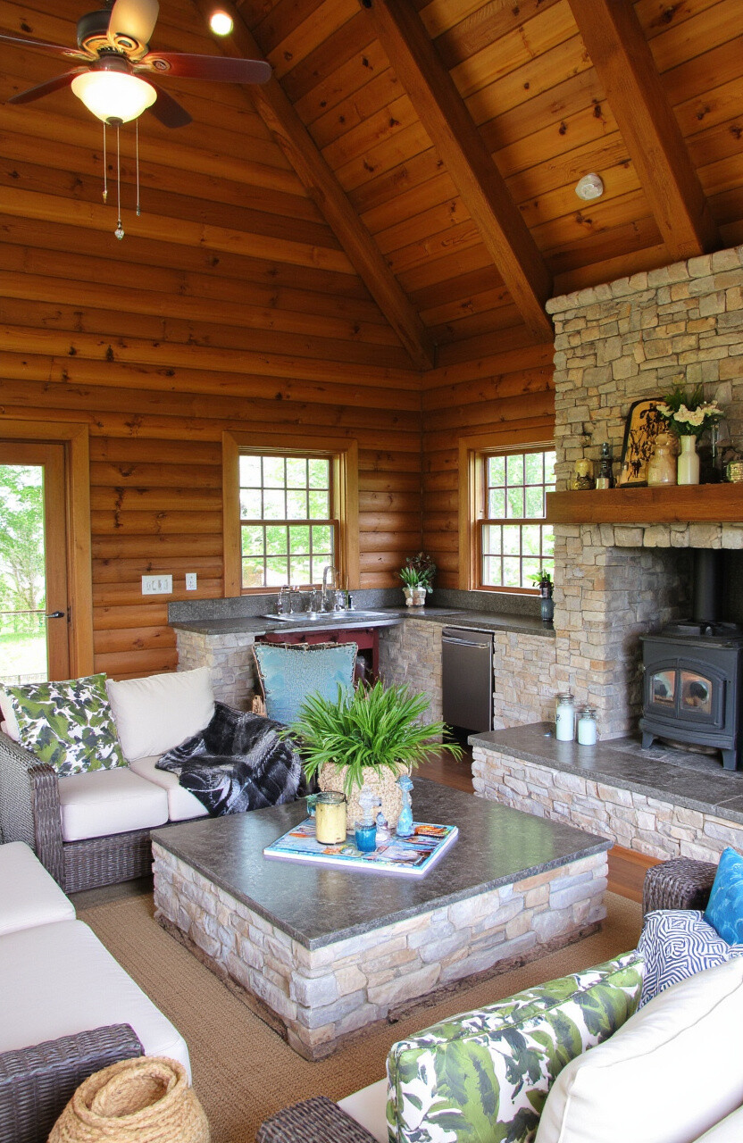 A cabin-themed terrace with a kitchen setup can feel like a mountain retreat. Use wood, stone, and cozy textiles for warmth. A wood-fired stove can add rustic charm.