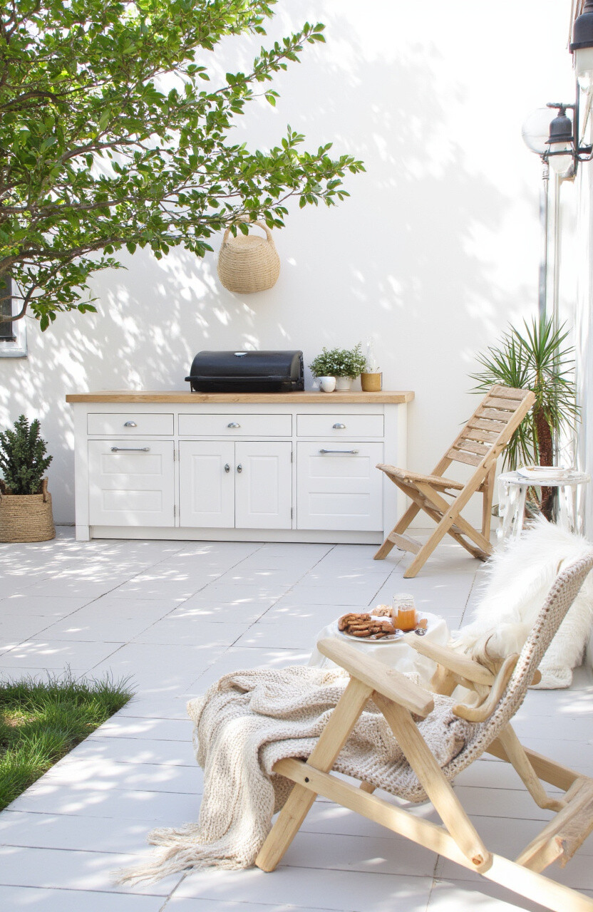 Think clean lines, neutral colors, and functional design for a Scandinavian-inspired terrace. Use light wood and minimal decor for a fresh look. A simple grill setup can be both practical and stylish.