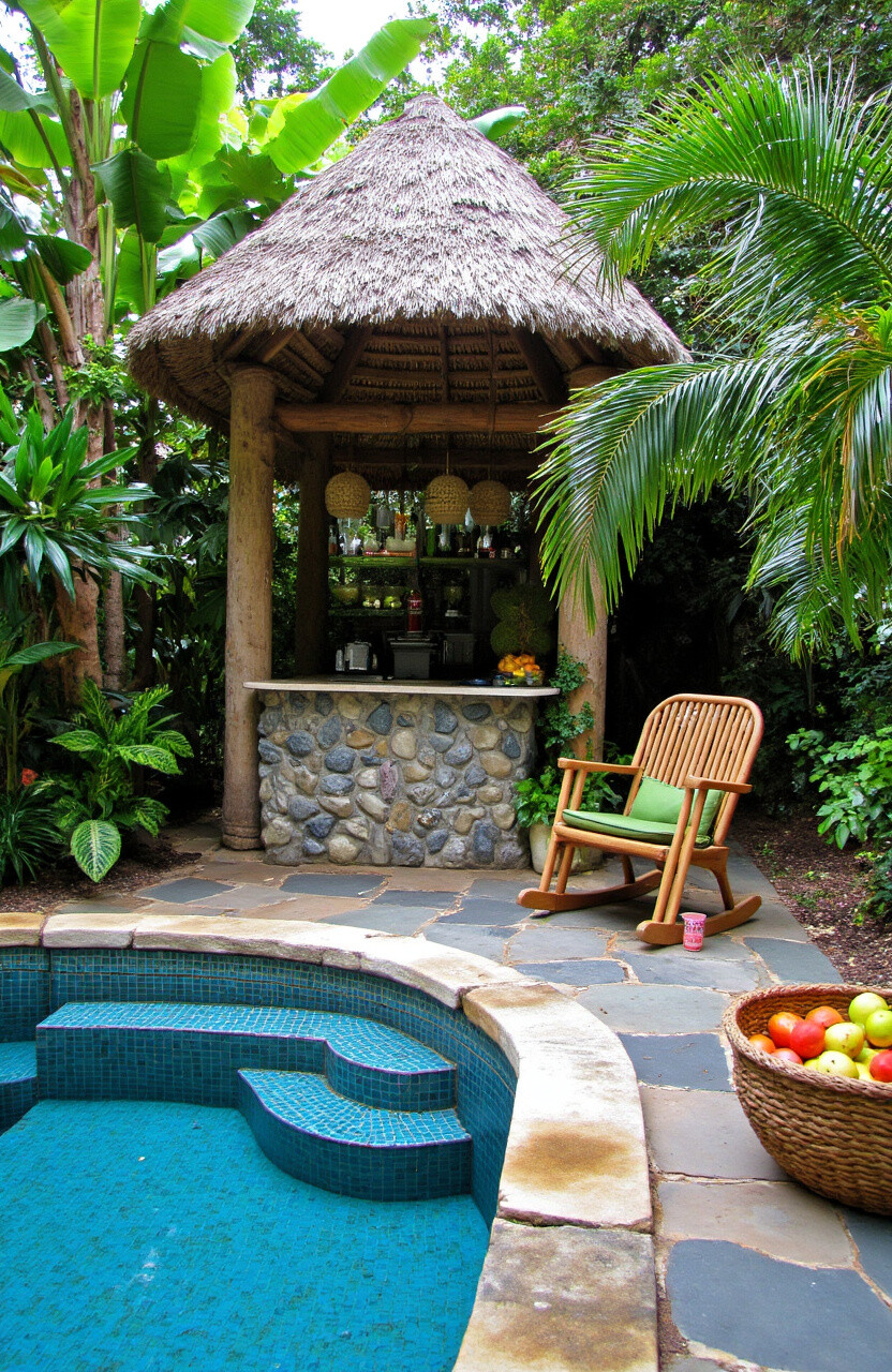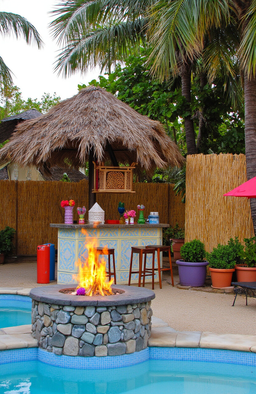 Imagine a tiki-themed pool terrace with a fun kitchen setup. Use bamboo, bright colors, and island-inspired decor. A tiki bar can serve delicious cocktails for a lively atmosphere.
