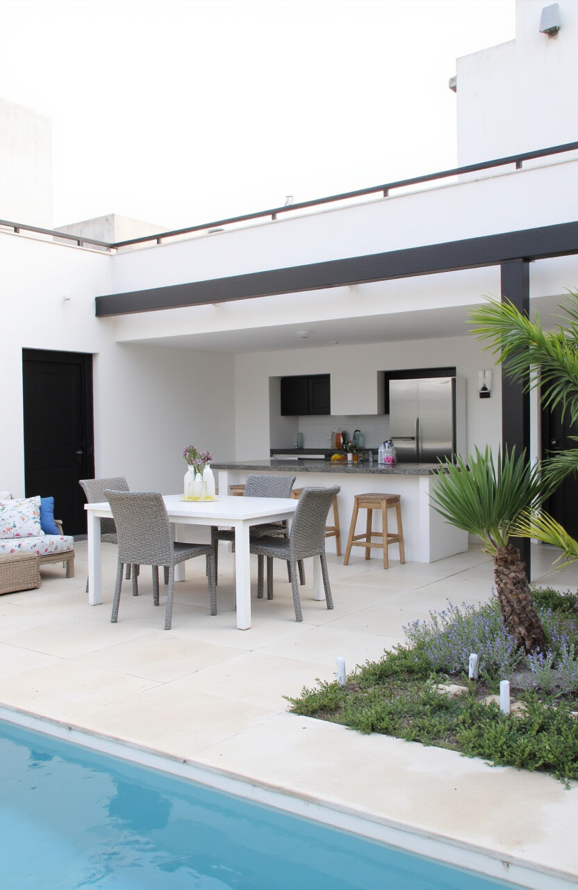 A farmhouse-inspired pool terrace can be cozy and charming. Use whitewashed wood, checkered patterns, and vintage kitchenware. A large dining table can host memorable meals with loved ones.