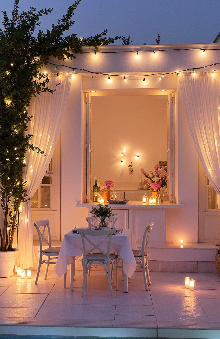 Imagine a romantic terrace with soft lighting, delicate decor, and a cozy kitchen. Use shades of pink and white, with floral accents. A small dining setup for two can be perfect for intimate dinners.