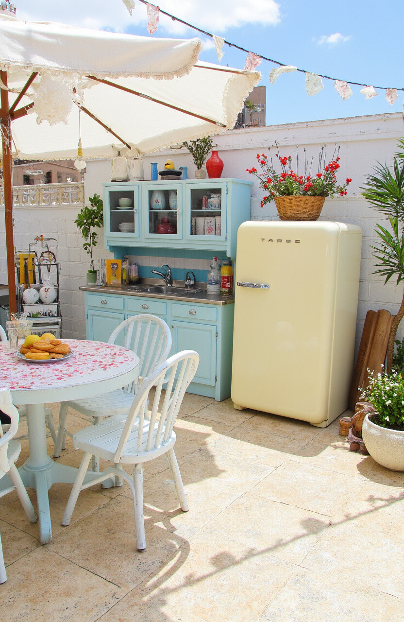 For a vintage-inspired terrace, think retro appliances and nostalgic decor. Use pastel colors and floral patterns to enhance the look. A retro fridge can be a fun focal point.