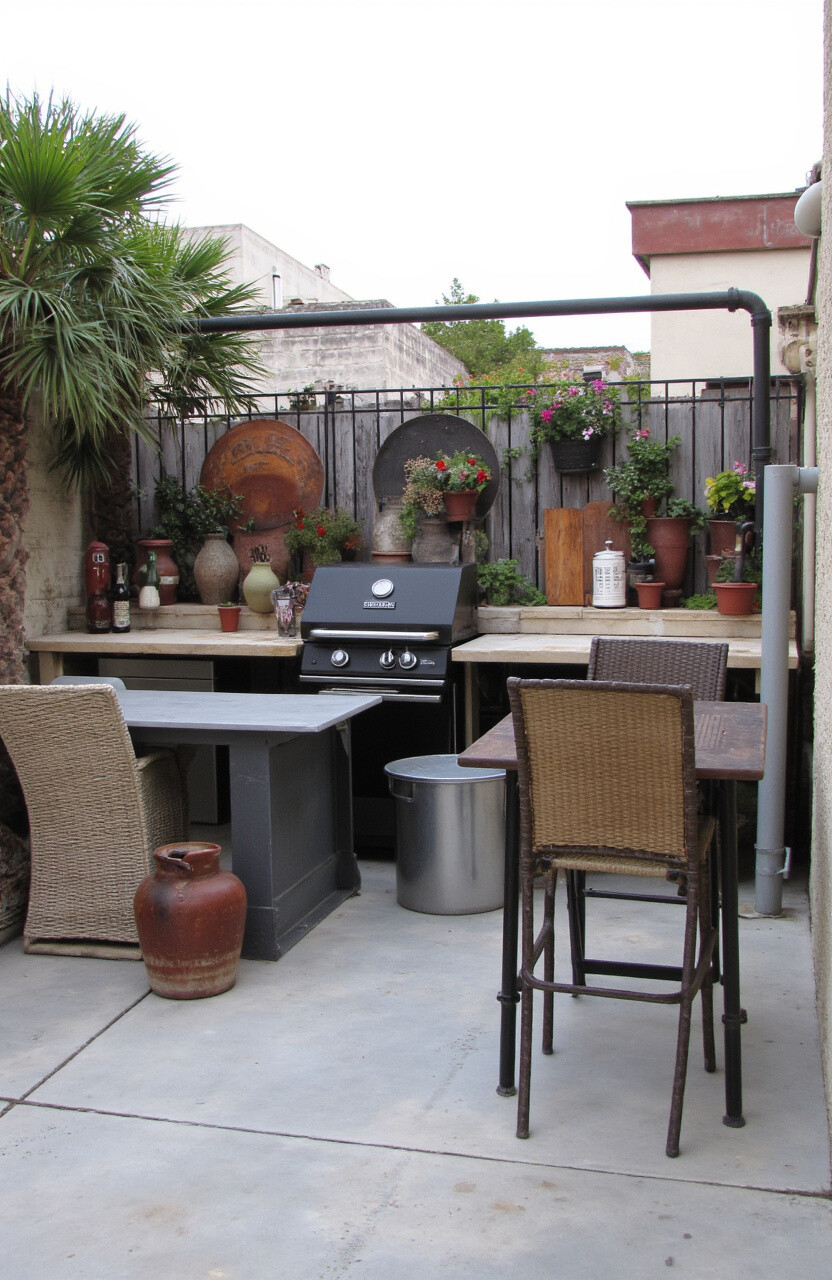 Picture an urban chic terrace with industrial elements like exposed brick and metal. A sleek kitchen island with bar stools can be the perfect spot for gatherings. Add some potted plants to soften the look.