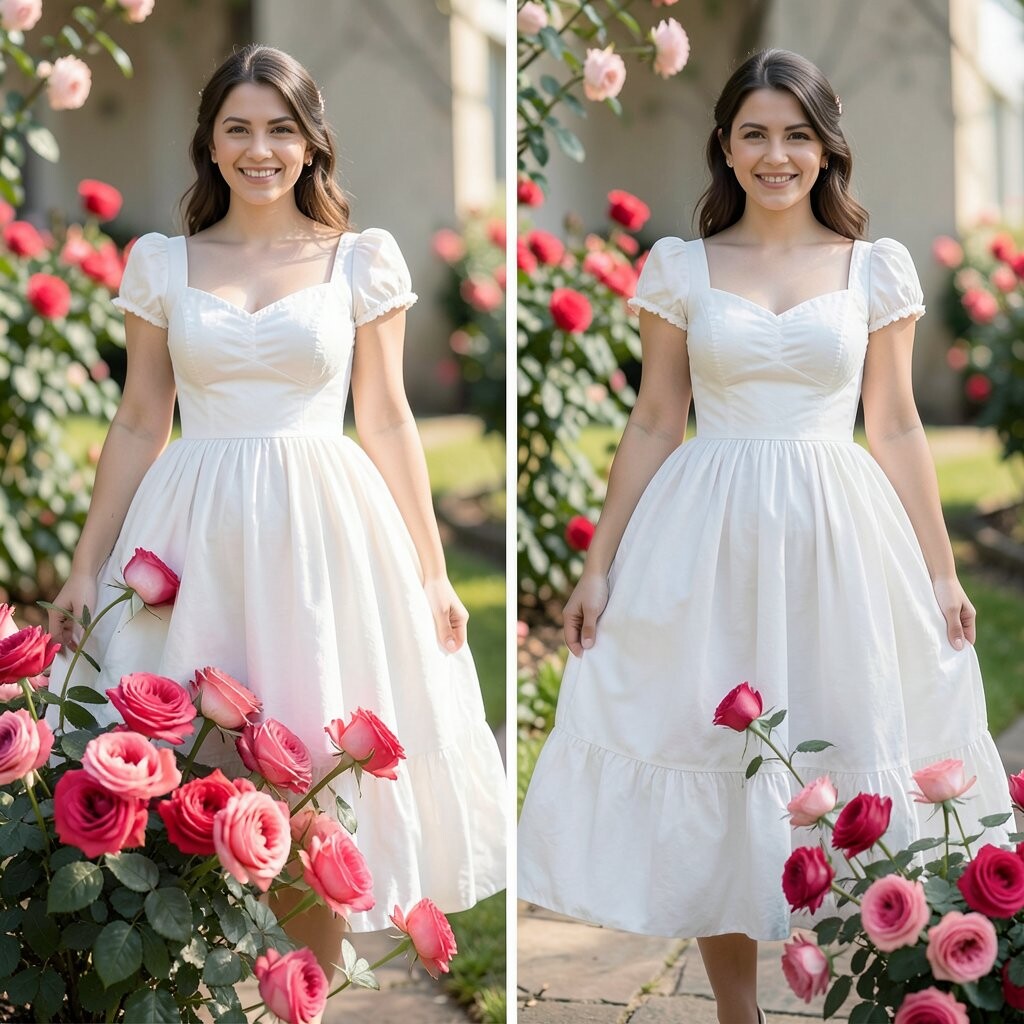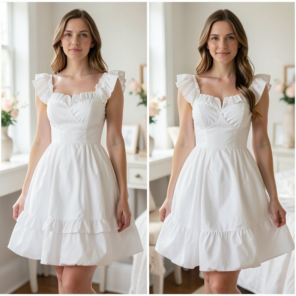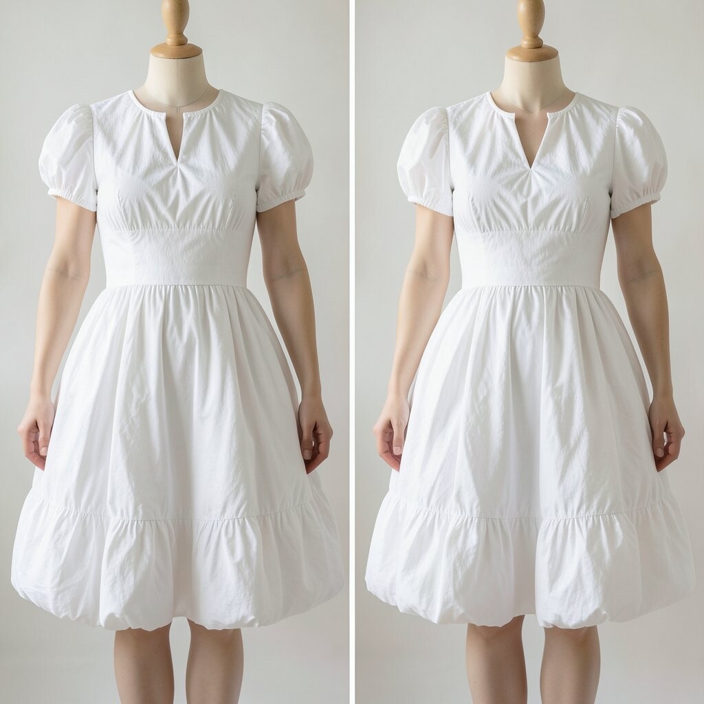 Picture a white dress with sleeves that puff out like cotton candy. It’s simple yet so elegant. Perfect for any occasion, whether it’s a wedding or a summer picnic.
