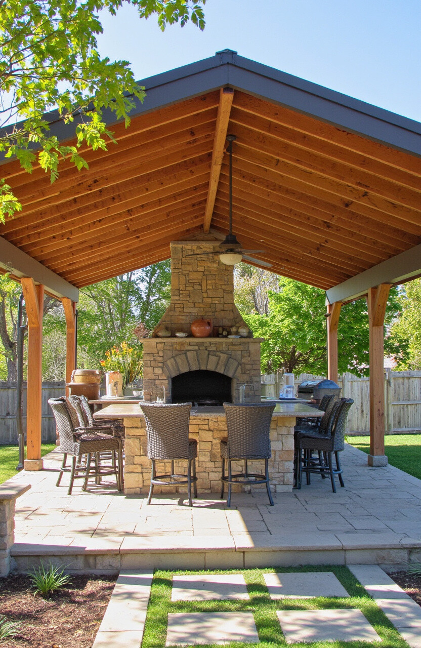 An open-air pavilion elevates outdoor dining. With a solid roof and open sides, it offers shelter while letting in fresh air. Pavilions are perfect for hosting larger gatherings.