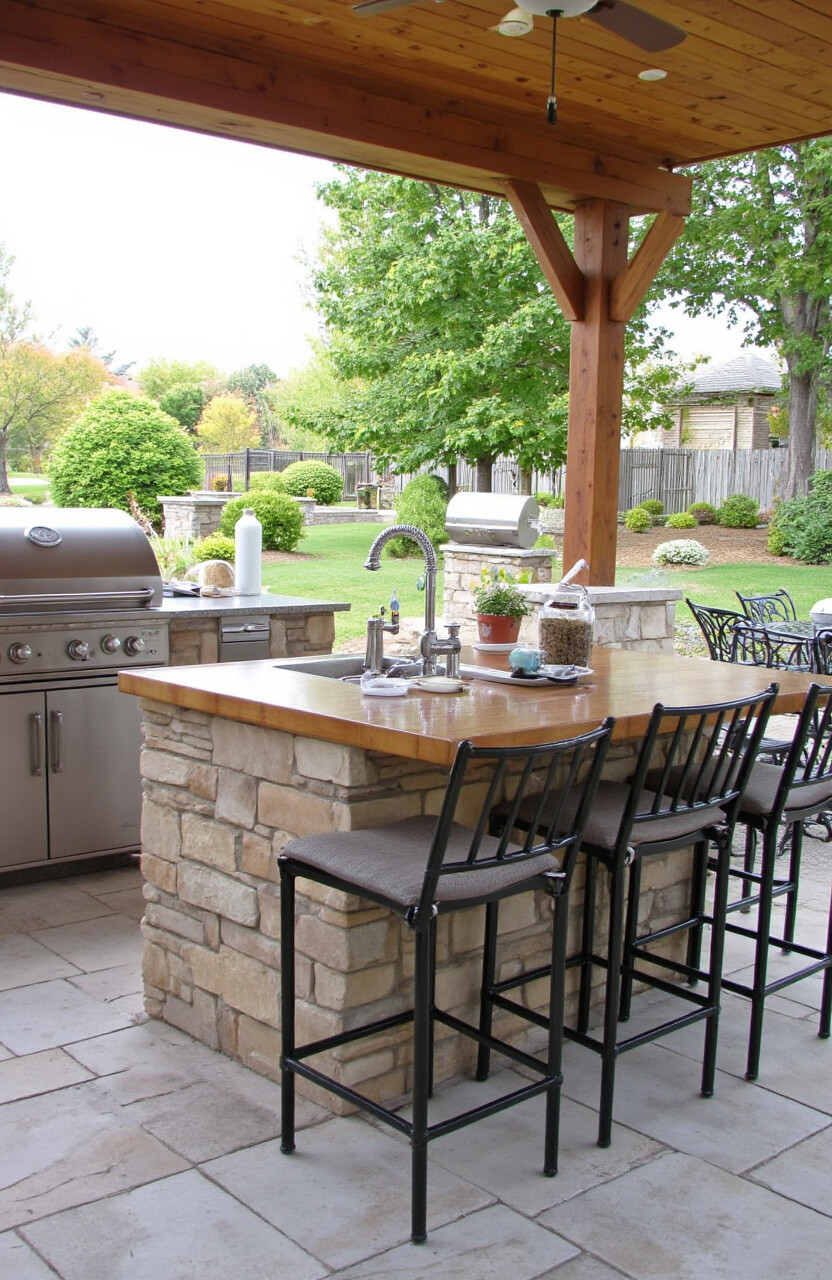 Wooden countertops bring warmth and rustic charm to your outdoor kitchen. Their natural look blends beautifully with the outdoors. They provide ample prep space for cooking up a feast.