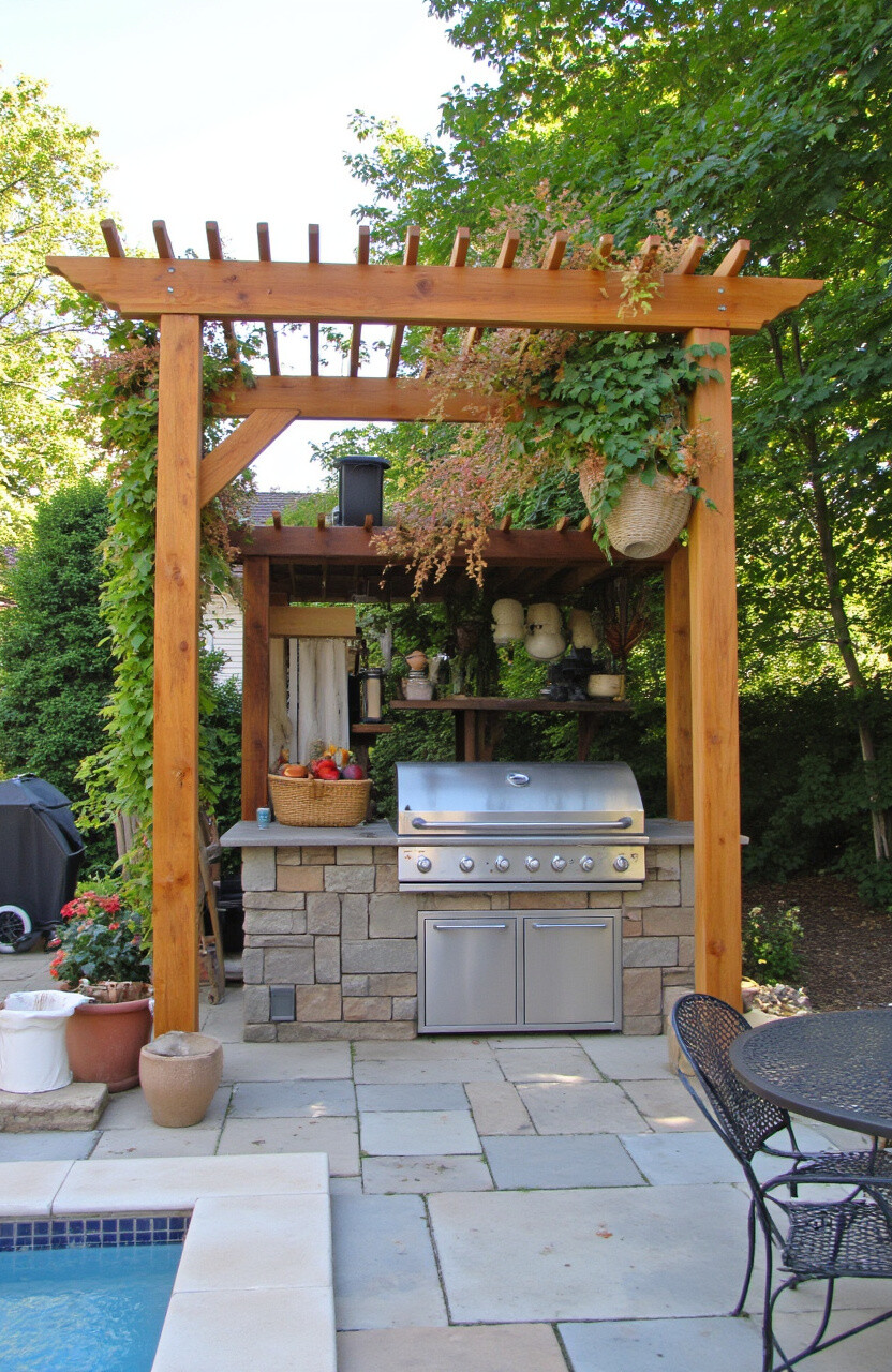 A wooden pergola over your grill area provides shade and a touch of elegance. Decorate it with climbing plants for a natural canopy. The pergola defines the space and makes it feel like an outdoor room.