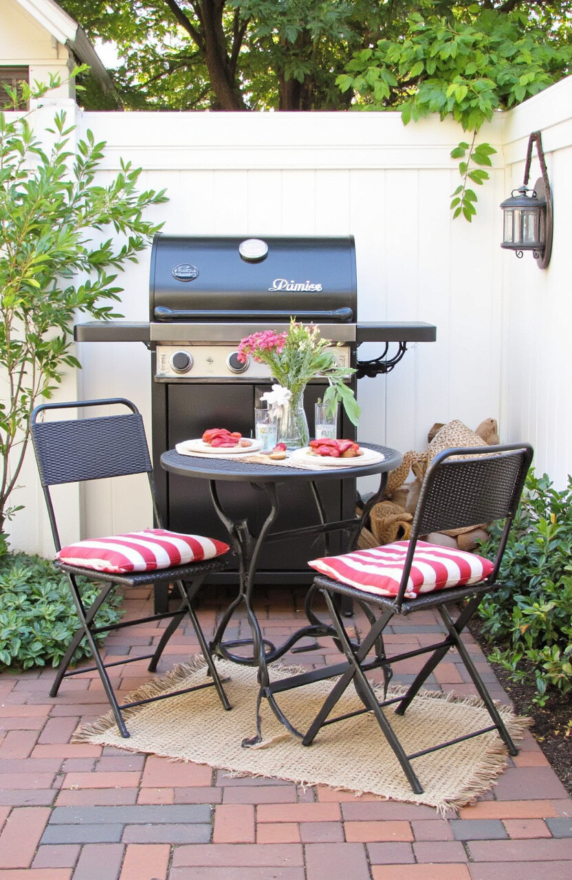 Set up a small bistro table and chairs for intimate dining. This nook creates a cozy spot to enjoy meals right by the grill. Bistro sets are charming and fit well in smaller spaces.