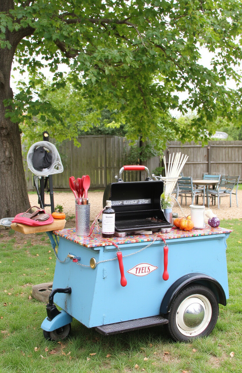 Imagine a vintage-style cart loaded with grilling gear. The whimsical design adds a playful touch to your backyard. Carts are portable, letting you move the grill station as needed.