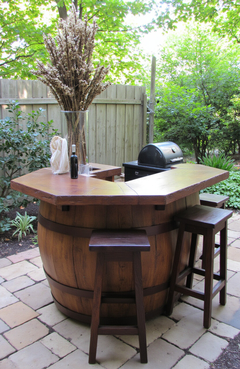 Repurpose a wine barrel into a charming outdoor bar. Its rustic look is perfect for serving drinks or appetizers. A wine barrel bar adds a touch of vineyard elegance to your space.