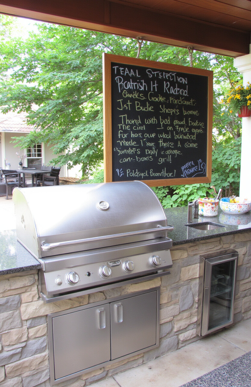 Hang a chalkboard near your grill to display the menu or doodle fun messages. It’s a playful way to engage guests and personalize the space. Kids and adults alike will enjoy this interactive element.