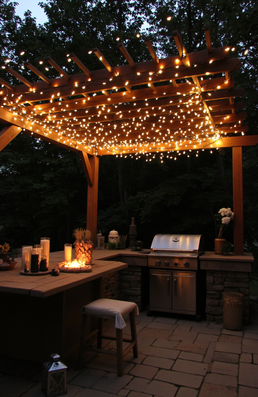 Hang a canopy of string lights above your grill area for a magical effect. The twinkling lights create a cozy, inviting ambiance. They’re perfect for evening gatherings and add a touch of romance.