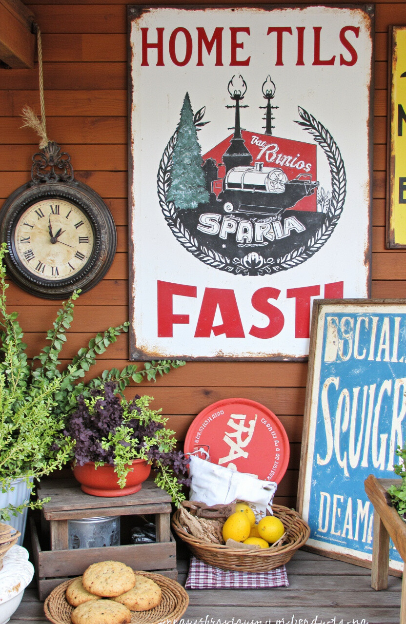 Decorate your space with vintage metal signs that tell a story. Think of old farm advertisements or quirky kitchen sayings. They add personality and a splash of color.