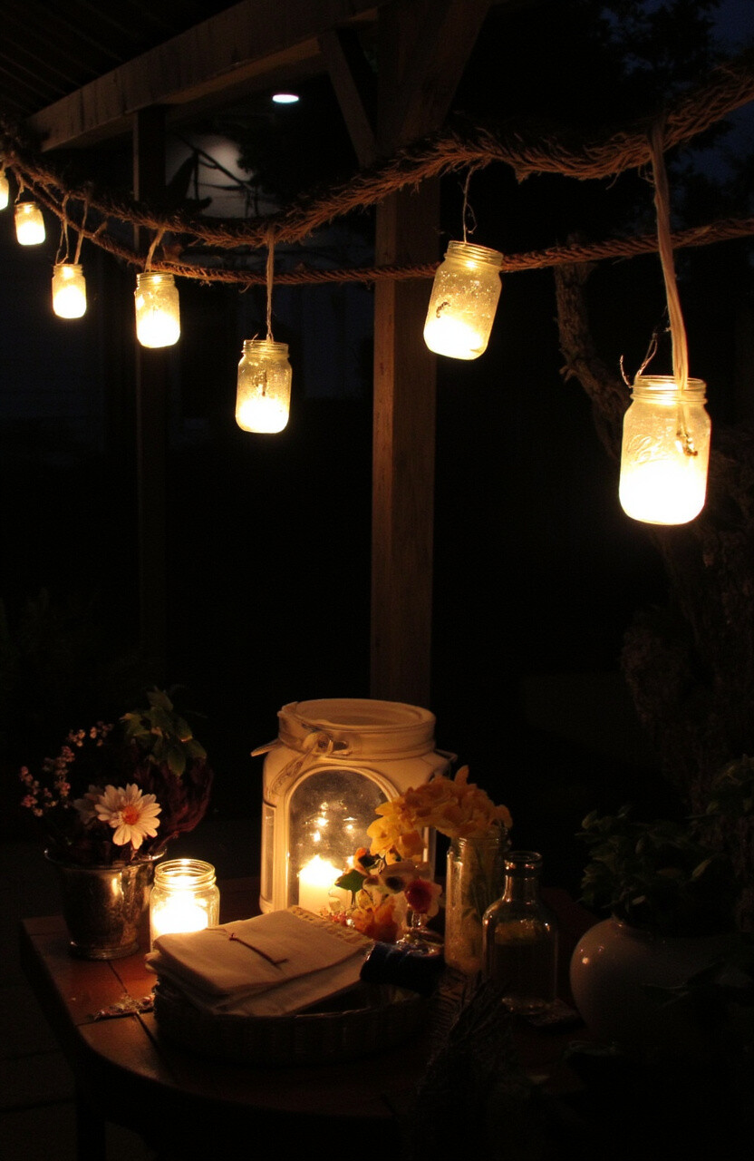 Light up your backyard with the soft glow of mason jar lights. Hang them from trees or along your patio cover. Their gentle illumination creates a cozy, welcoming vibe.