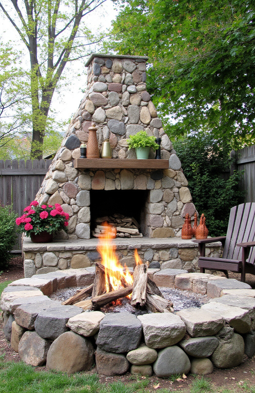 A rustic fire pit becomes a gathering spot for cozy evenings. Choose stone or metal for a rugged look. It serves as both a cooking space and a heat source.