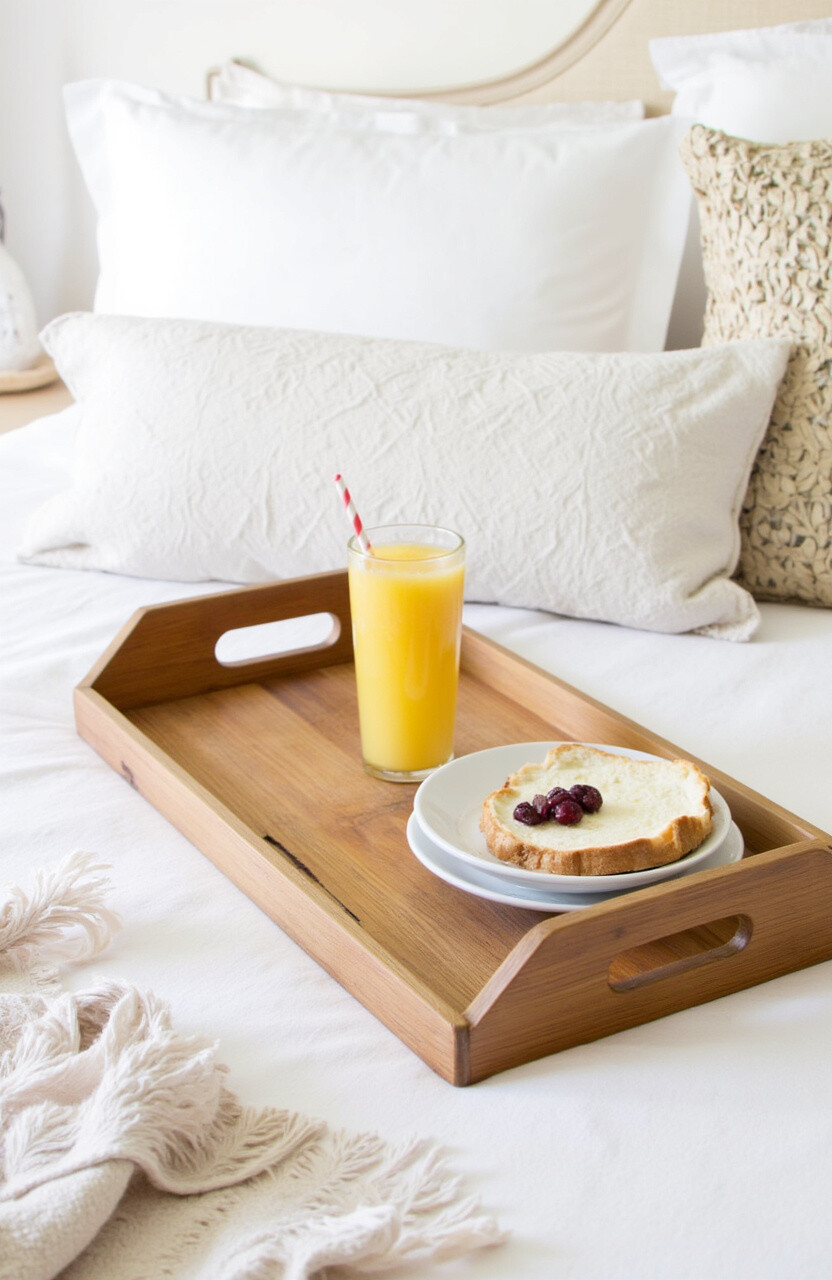 Bamboo trays are not only stylish but also sustainable. They’re lightweight and come in various natural finishes.