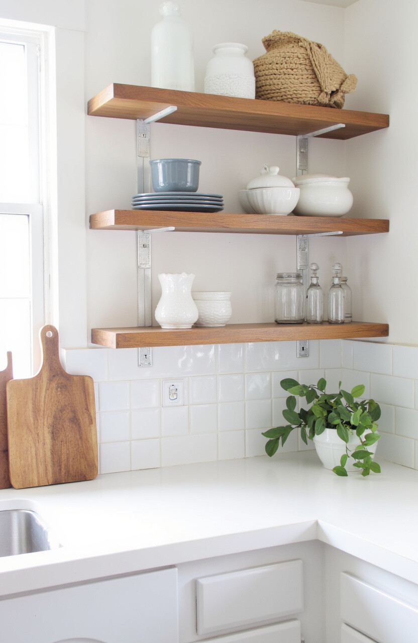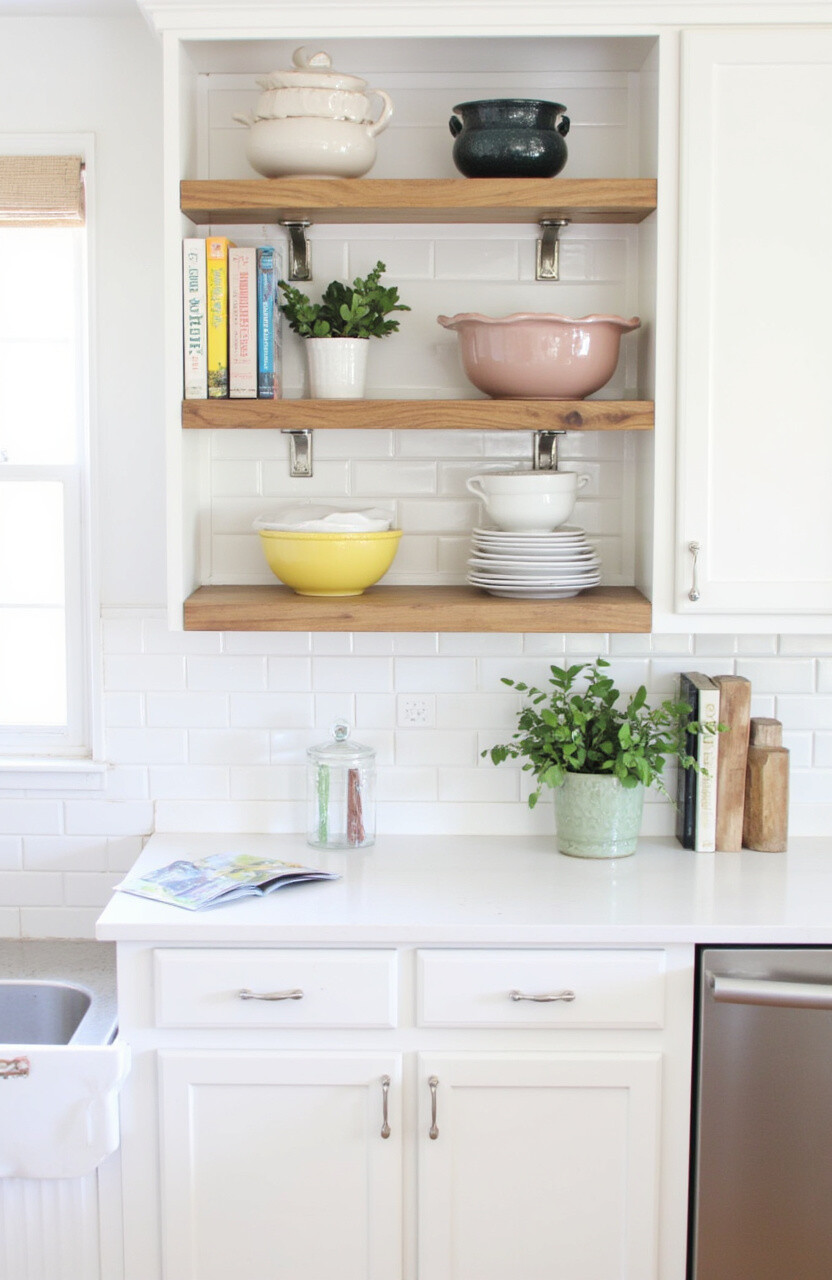 Replace a few upper cabinets with open shelves. This makes the kitchen look more spacious and allows you to showcase your favorite dishes. Open shelves can be styled with plants, cookbooks, or colorful bowls.