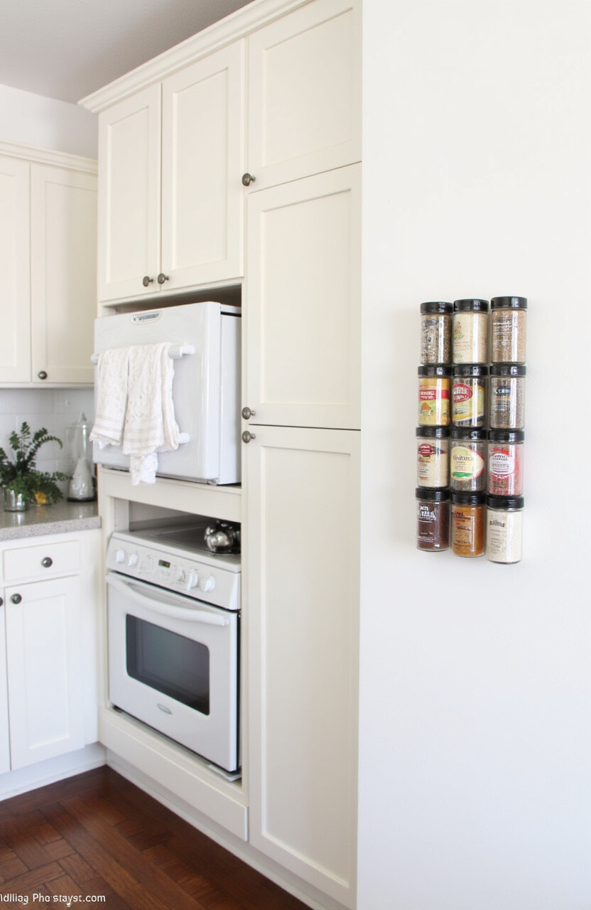 Install a magnetic spice rack on a wall or the side of a cabinet. This keeps spices within reach and frees up cabinet space. Magnetic jars are both functional and decorative.