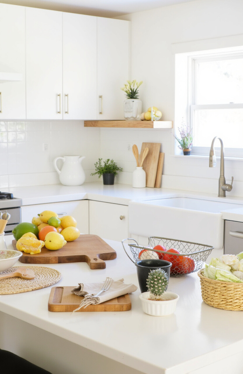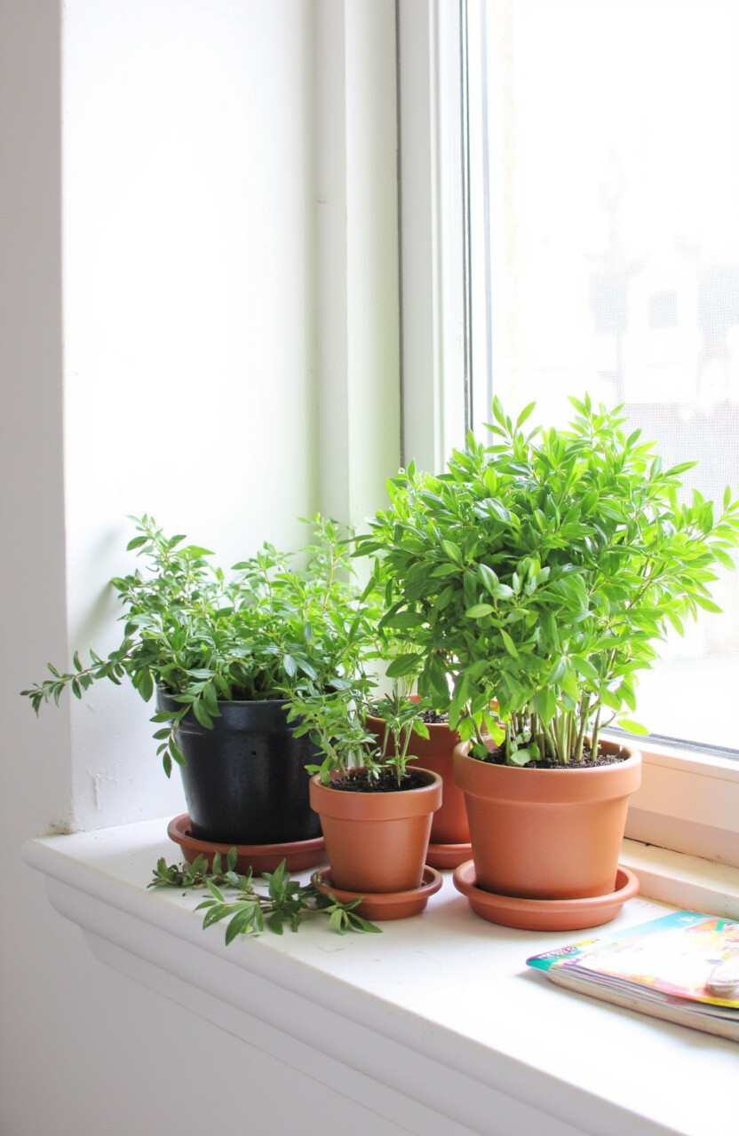 Place potted herbs on windowsills or countertops. They add greenery and can be used in cooking. Fresh herbs like basil or mint are not only pretty but also fragrant.