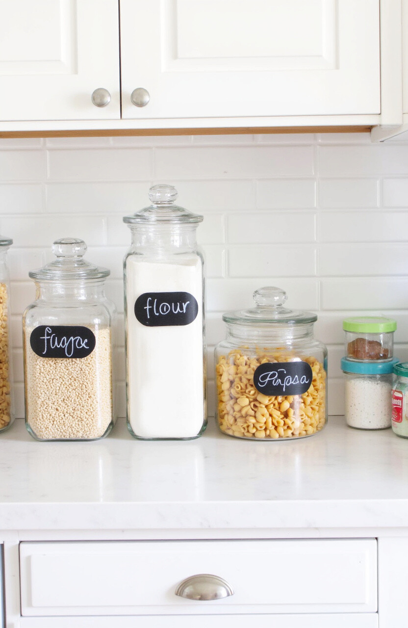 Use stylish storage jars for pantry staples like flour, sugar, and pasta. Clear jars keep contents visible and add a uniform look. Choose jars with chalkboard labels for easy updating.