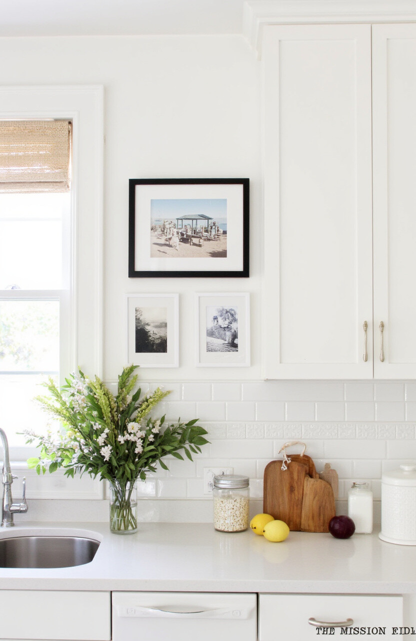 Arrange art or photos on a wall to create a gallery effect. Choose pieces that reflect your personality or family memories. This adds warmth and makes the kitchen feel more like a home.