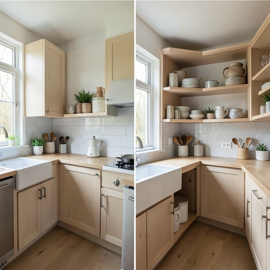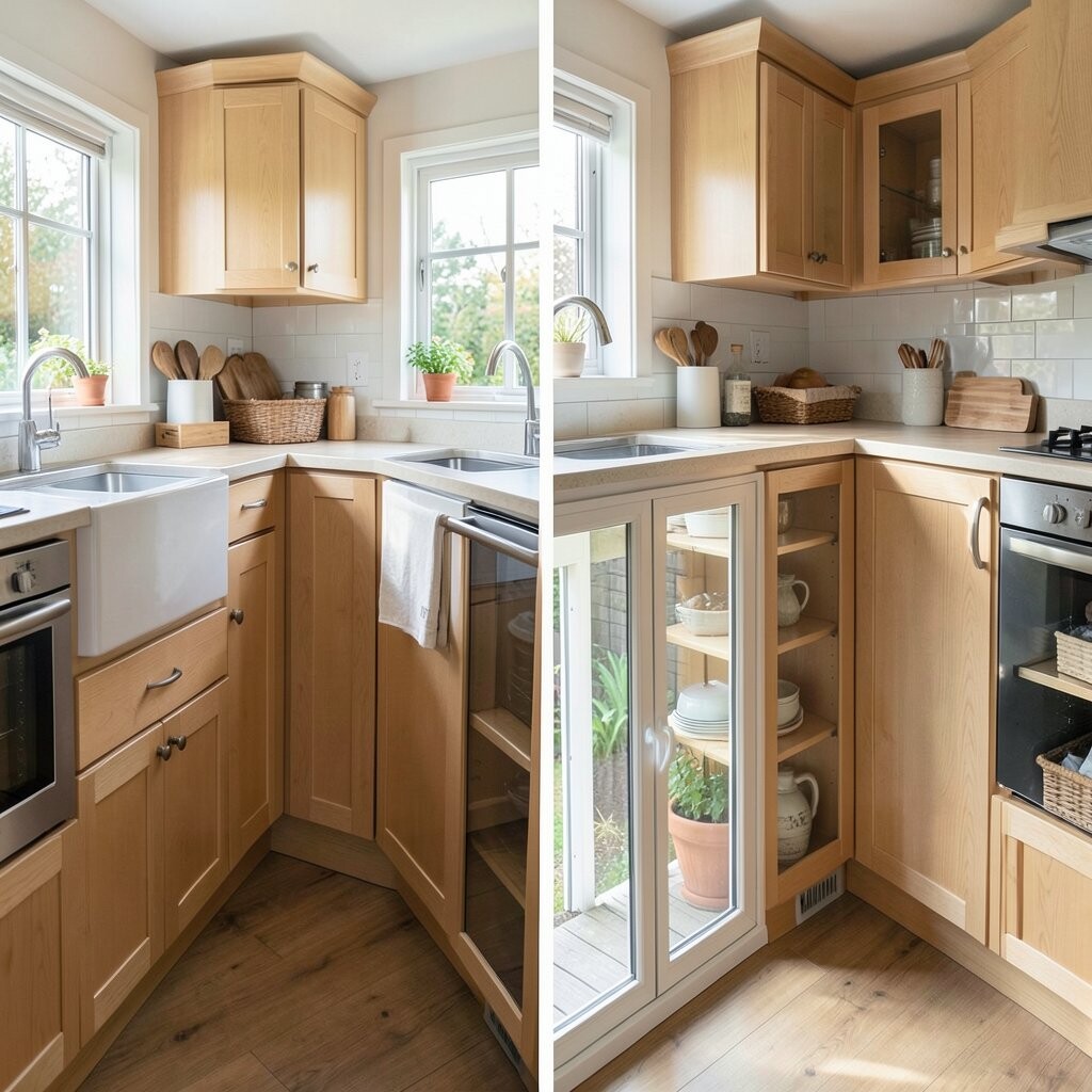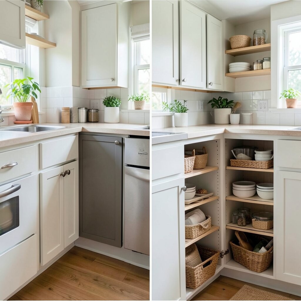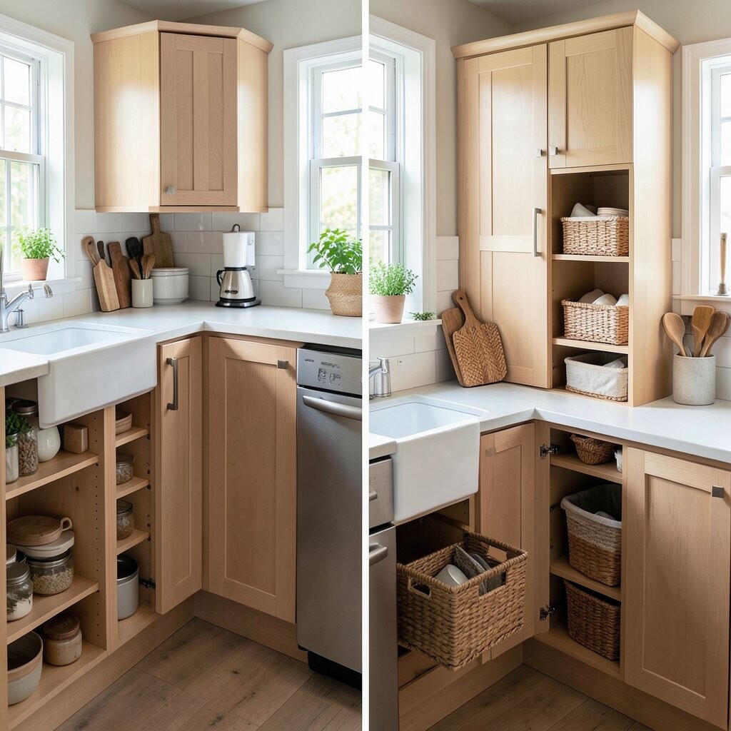 Before, the corners were wasted and full of random items. After, smart corner shelves, a lazy Susan, and pull-out trays made every inch count. It feels neat, clever, and a little bit magical.