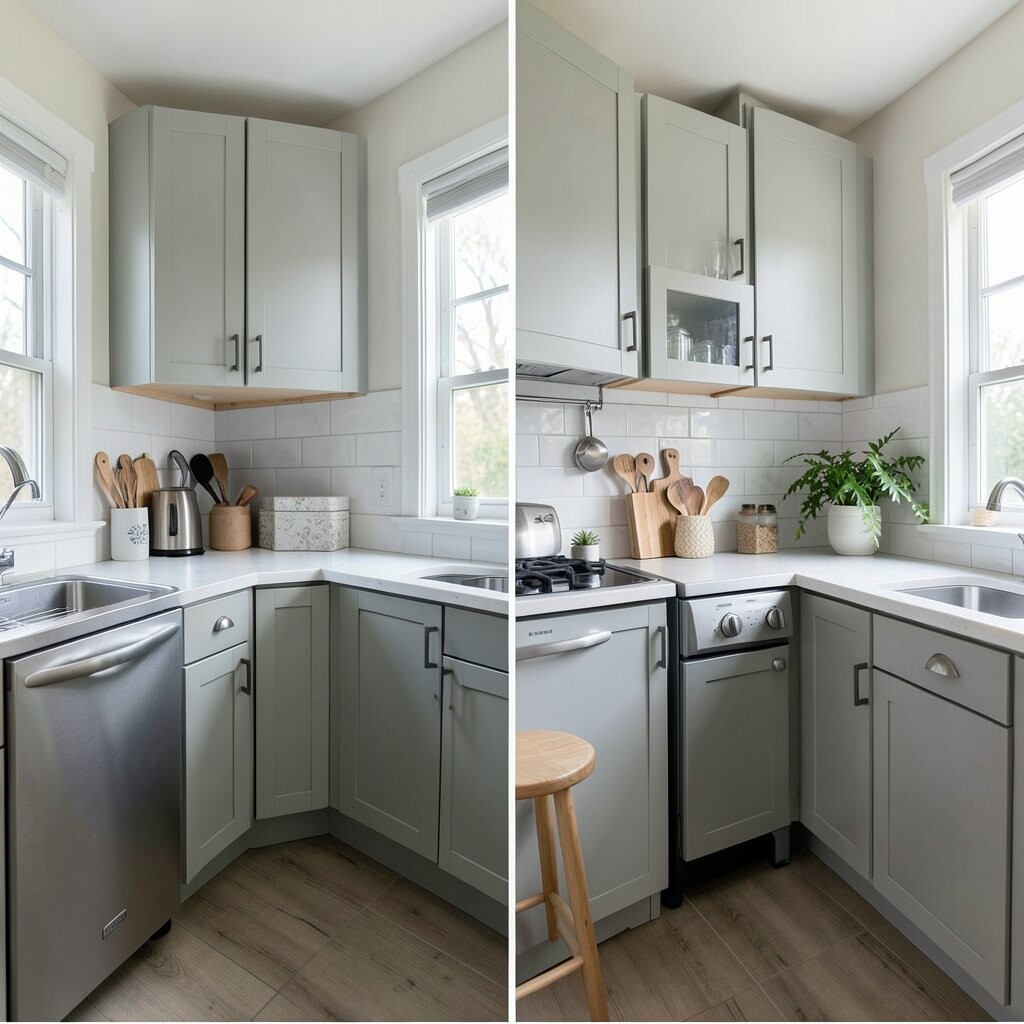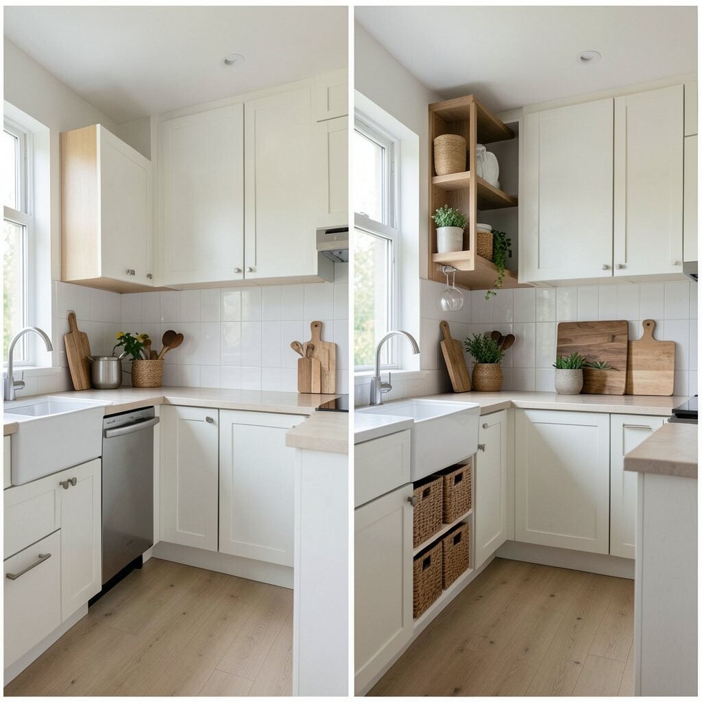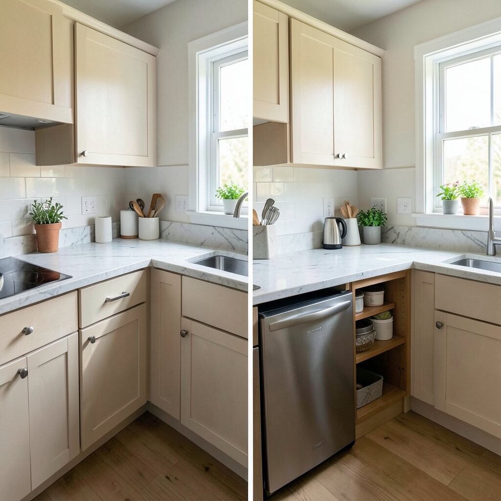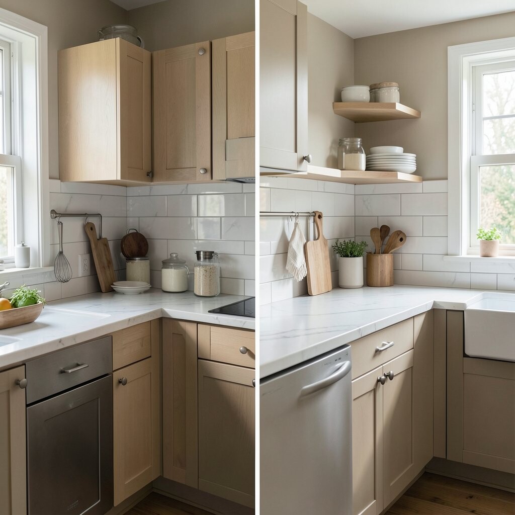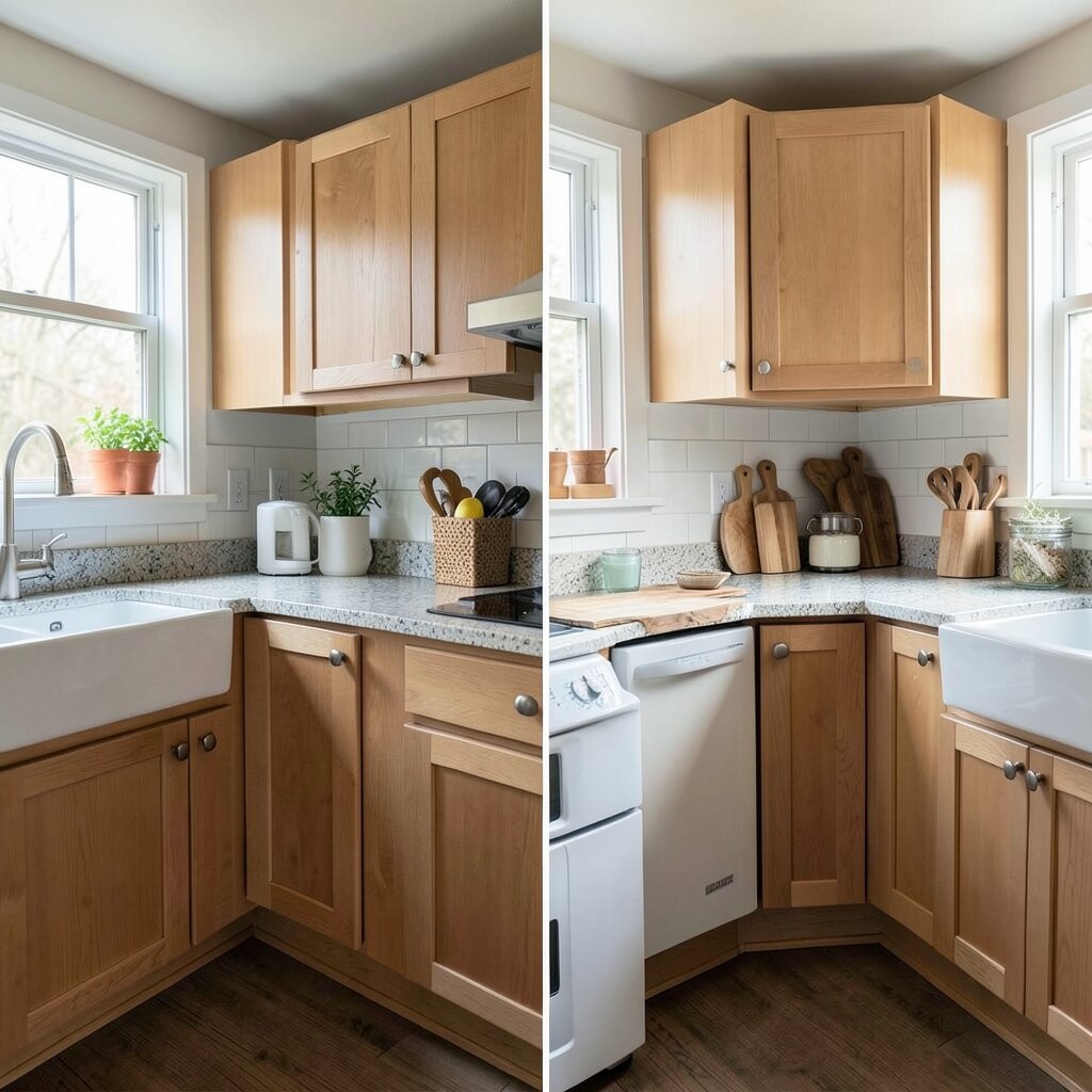Before, the corners were wasted and full of random items. After, smart corner shelves, a lazy Susan, and pull-out trays made every inch count. It feels neat, clever, and a little bit magical.