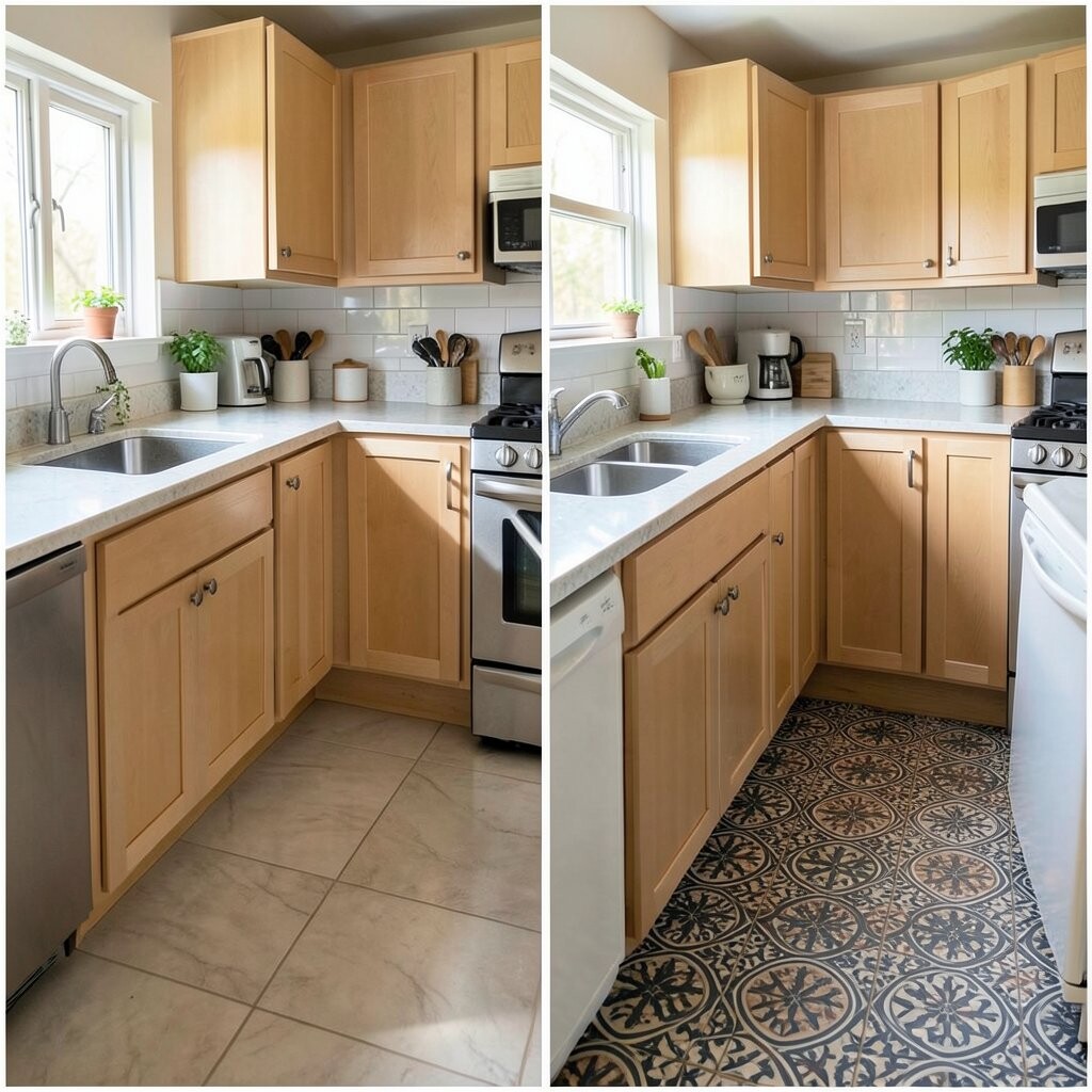 Before, the floor was plain and forgettable. After, patterned tile or a bold vinyl design gave the kitchen a fun, stylish twist. The room went from simple to full of charm.