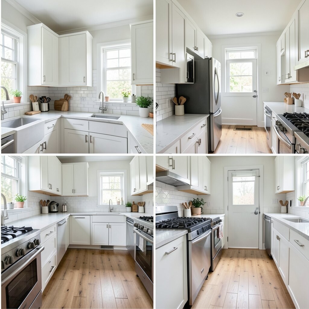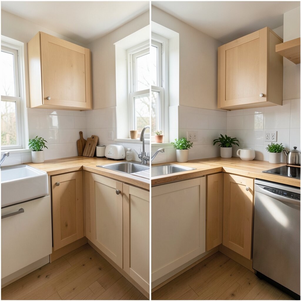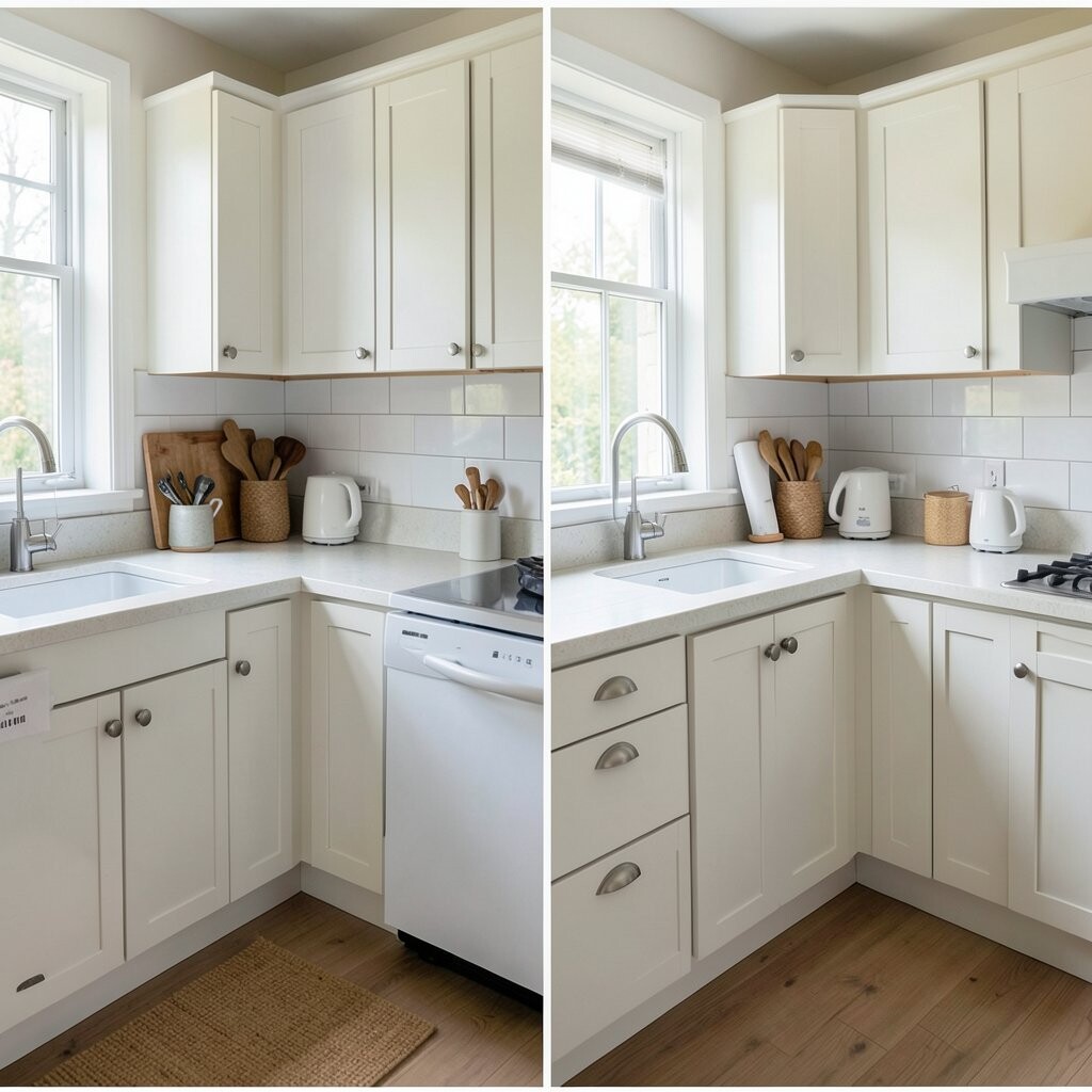 Before, the cabinets had plain, worn-out knobs. After, new pulls in brass, matte black, or soft nickel gave the kitchen a fresh face. It was a small change that made a big style splash.