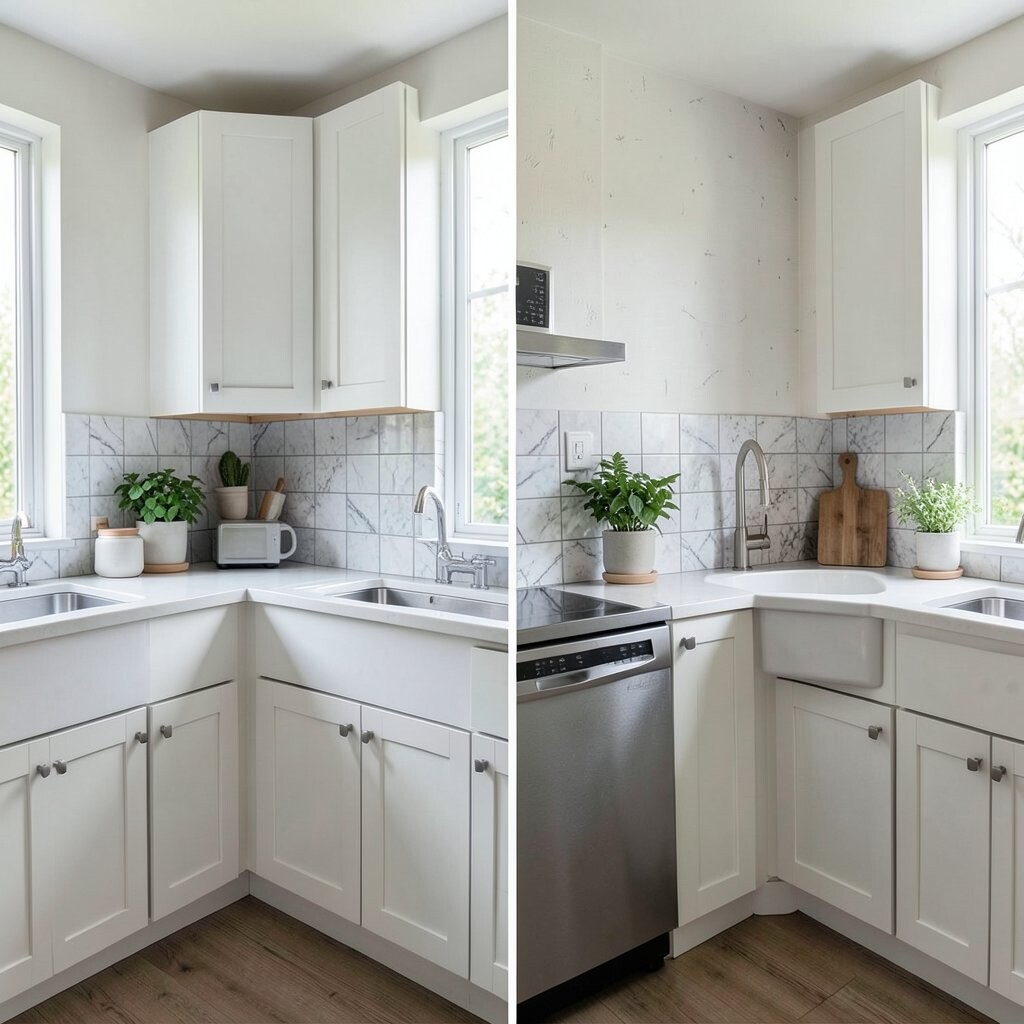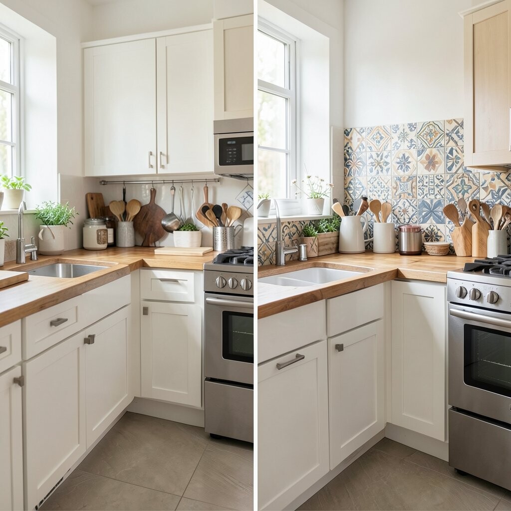 Before, the area behind the sink was plain and easy to ignore. After, a mini feature wall with tile, paint, or peel-and-stick design gave it instant charm. It made the whole kitchen feel more styled.