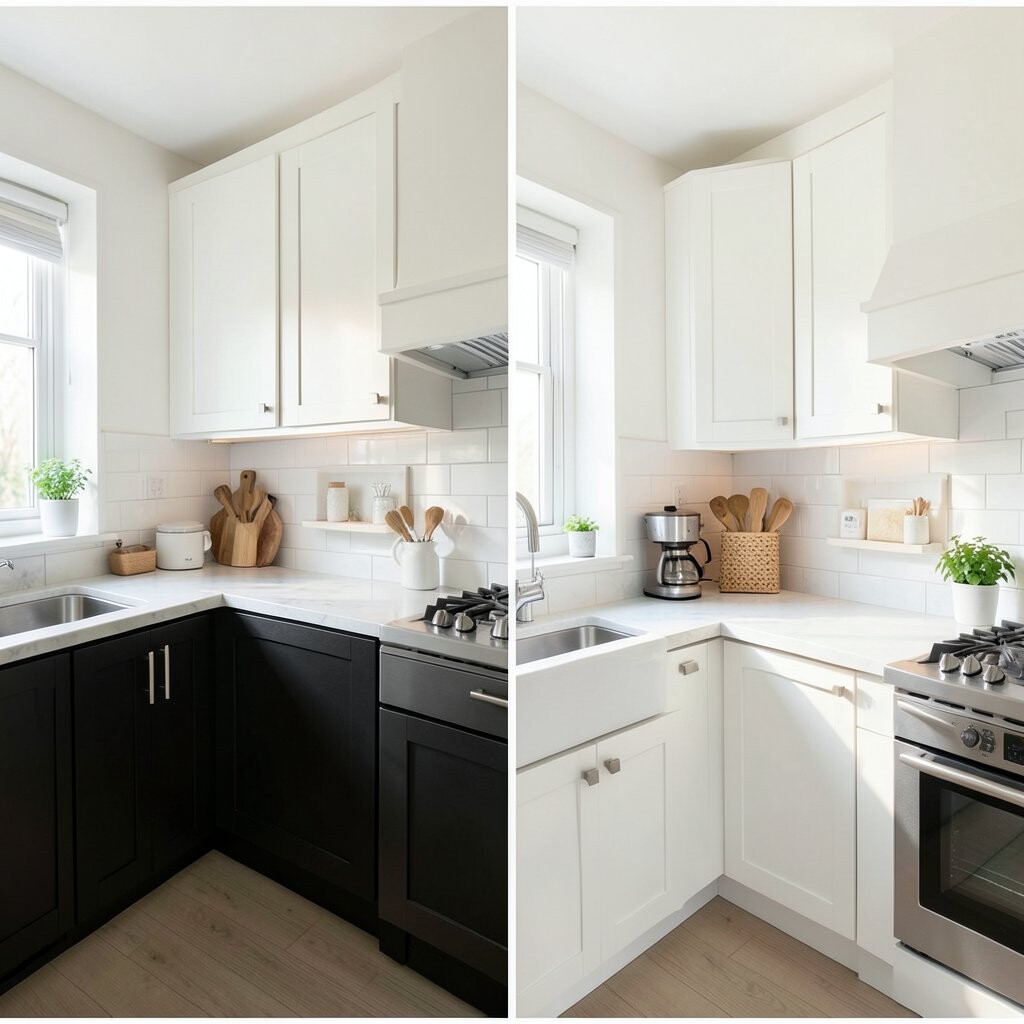 Before, the colors felt random and a little noisy. After, a two-tone plan with light uppers and deeper lowers made the kitchen feel balanced and stylish. It looked polished without feeling fussy.