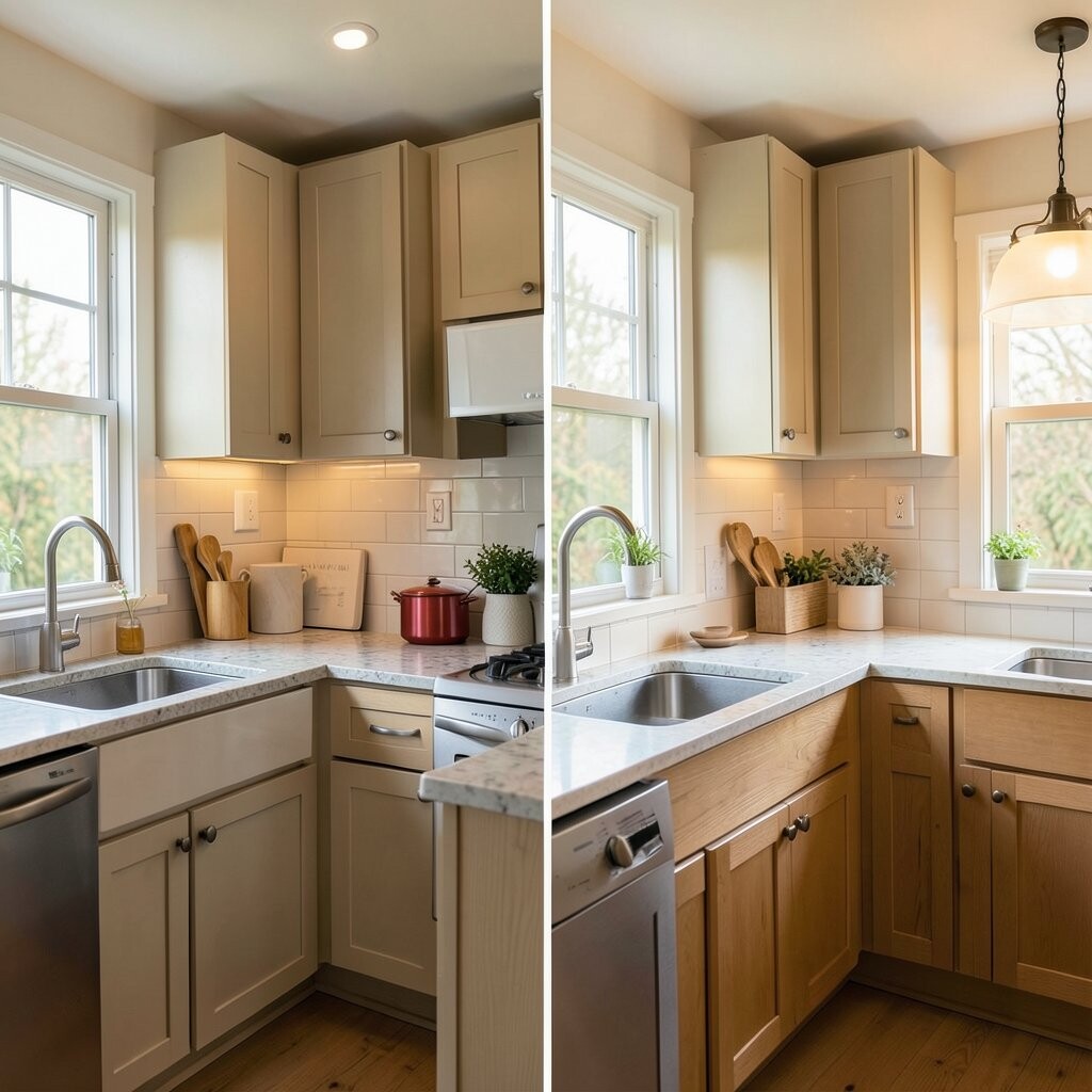 Before, one weak light left the kitchen feeling dull and shadowy. After, layered lighting with under-cabinet strips and a cute pendant made everything glow. It felt cozy and much easier to work in.