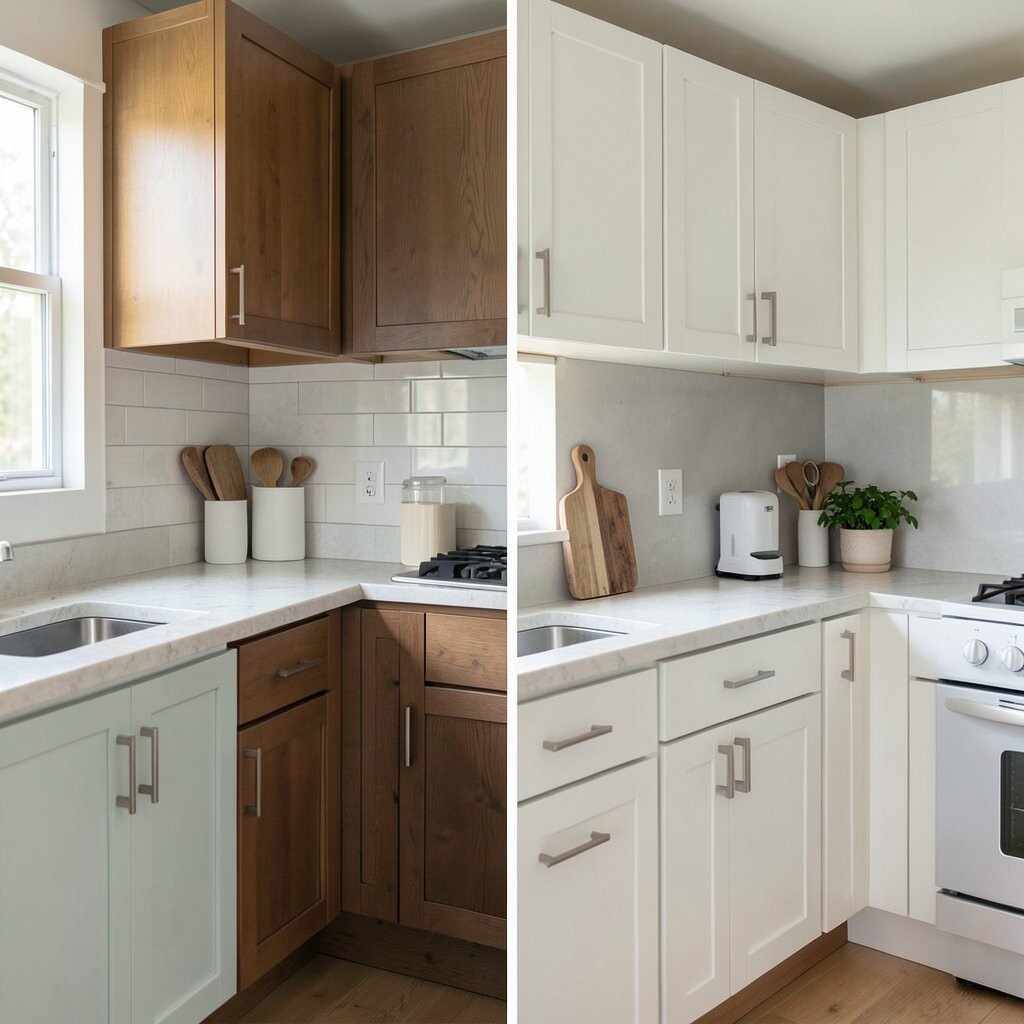 Before, the dark cabinets made the kitchen feel heavy and smaller than it was. After, soft white doors and warm light turned it into a bright, happy spot. The whole room suddenly felt airy, like it could breathe.