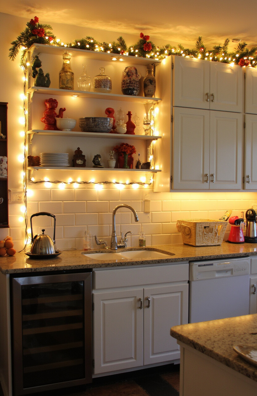 .. String fairy lights around open shelving or along the tops of cabinets. They create a whimsical and enchanting atmosphere.