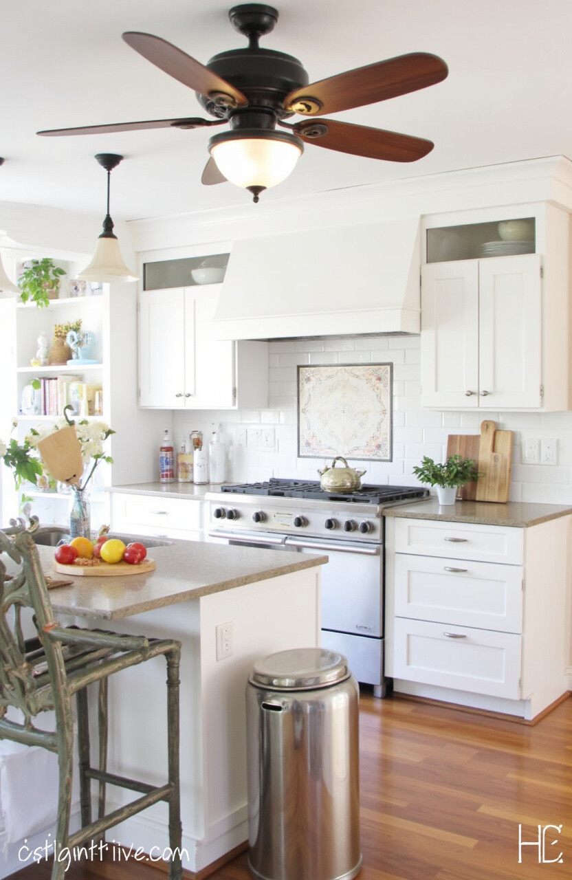 .. A ceiling fan with a light fixture is a two-in-one solution. It keeps your kitchen cool while providing soft lighting.