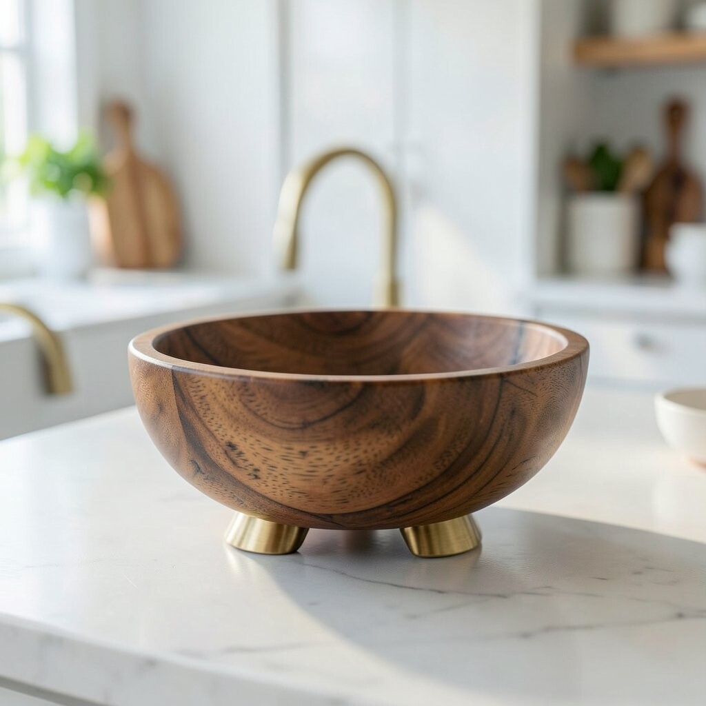 A wooden bowl on brass feet feels a little fancy and very eye-catching. The tiny metal lift gives the bowl a jewel-like look on the counter.