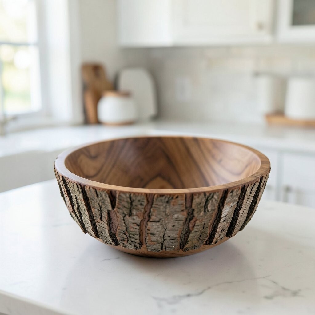 A bark-inspired bowl keeps the wood feeling close to nature. The surface may look rough in places, which adds a wild and cozy charm.
