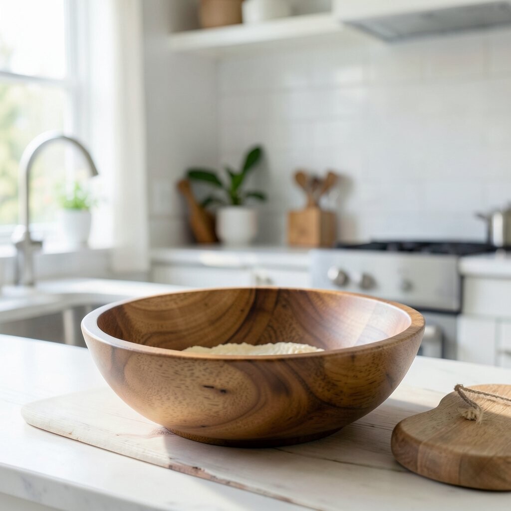 A deep wooden bowl made for dough rising is a dream for home bakers. It gives bread dough room to grow while keeping the kitchen looking warm and real.